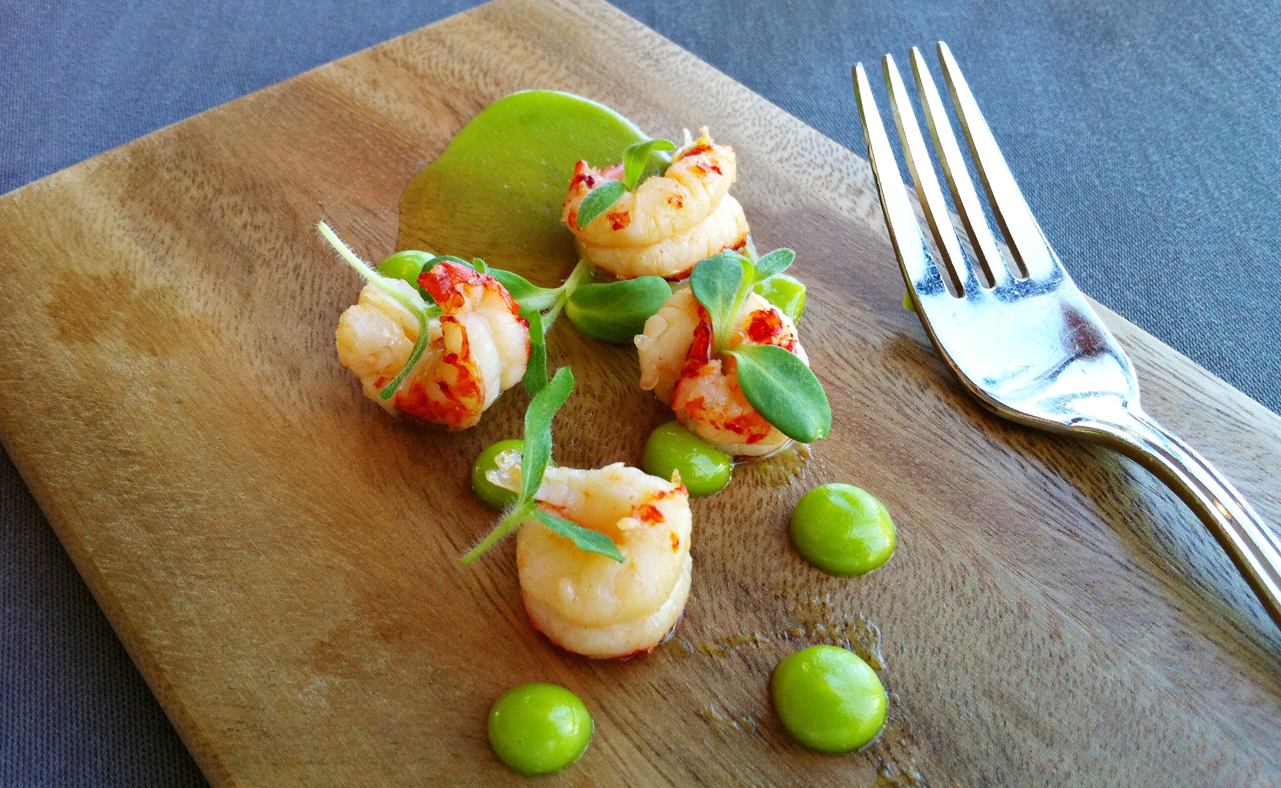 Amuse toimi tarkoituksenmukaisesti: muutama maukas jokiravun pyrstö persilja-valkosipulimajoneesin ja auringonkukanversojen seurassa herätteli odotuksia. Asettelun aistikkuus pisti positiivisesti silmään, ja kuten illan mittaan selvisi, asetti odotusarvot kohdalleen myös visuaalisuuden osalta.