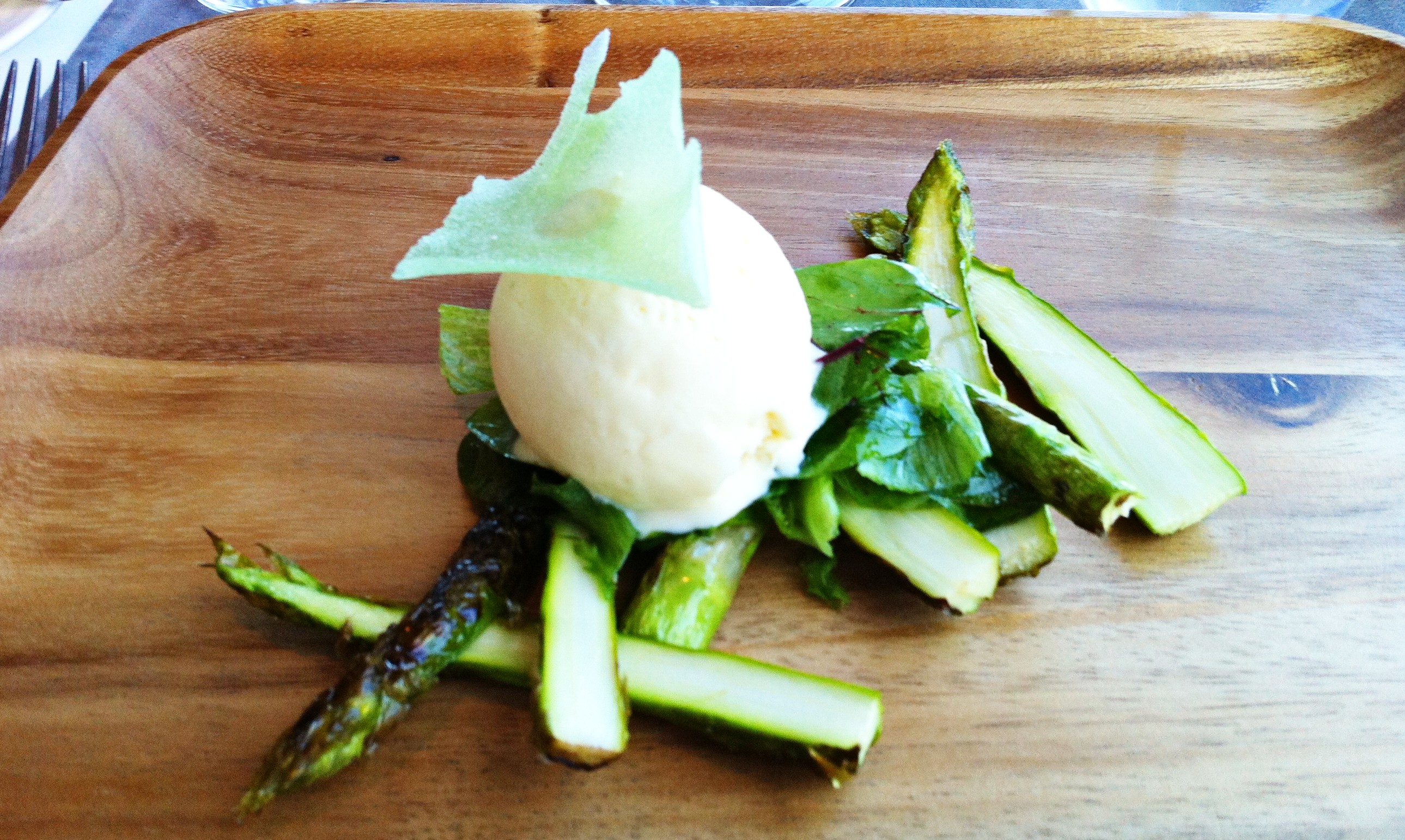 Ensimmäinen alkuruoka, em. parsa-annos, ei pettänyt odotuksia makujen eikä ulkonäön suhteen. Petoeläimenä olen tottunut pitämään parsaa pääasiassa pahaisena lisukkeena, mutta tämän kasvisannoksen nautin ihan mielelläni. Erityisesti paahdetun vihreän parsan herkullinen grillimäinen aksentti yhdistettynä valkoparsajäätelön hienostuneeseen tyyneyteen hersytteli makuhermojani. Juomana ravintolan omaa maahantuontia saksalainen S. A. Prüm Pinot Blanc 2008 tuki etenkin valkoparsajäätelöä ansiokkaasti.