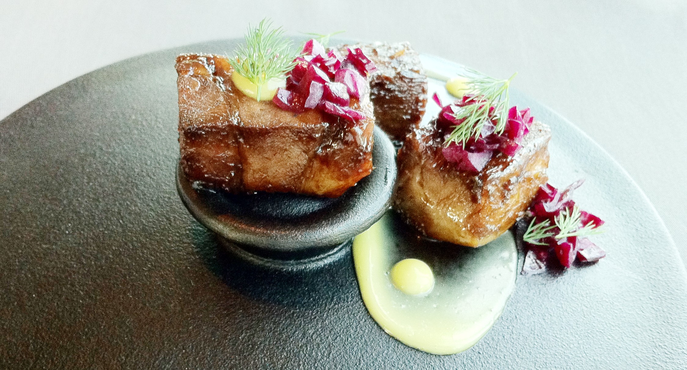 Seuraavaksi piti tulla kuhaa ja vodkaa, mutta erehdys kuin tärähdys, tulikin ensin possun niskaa ja tilliä pikkelöidyn punakaalin kera. Tilli kuuluu liki-inhokkeihini, mutta tässä sen maku ei häirinnyt vaan jopa sopi. Possu oli poikkeuksellisen erinomaista: huteran muistini puitteissa väitän, että tämä mehukkaan pehmeäksi kypsytetty pinnalta rapeaksi karamellisoitu possunniska sijoittuu kahden parhaan koskaan syömäni possuannoksen joukkoon. Tämä oli myös erityisen kaunis annos possuksi: valurautakattilan kannelle kauniisti asetellut lihapalat värikkäine punakaali- ja tillikomponentteineen hivelivät silmää. Lasissa piemontelainen Donna Elena Barbera d’Alba Superiore 2008.