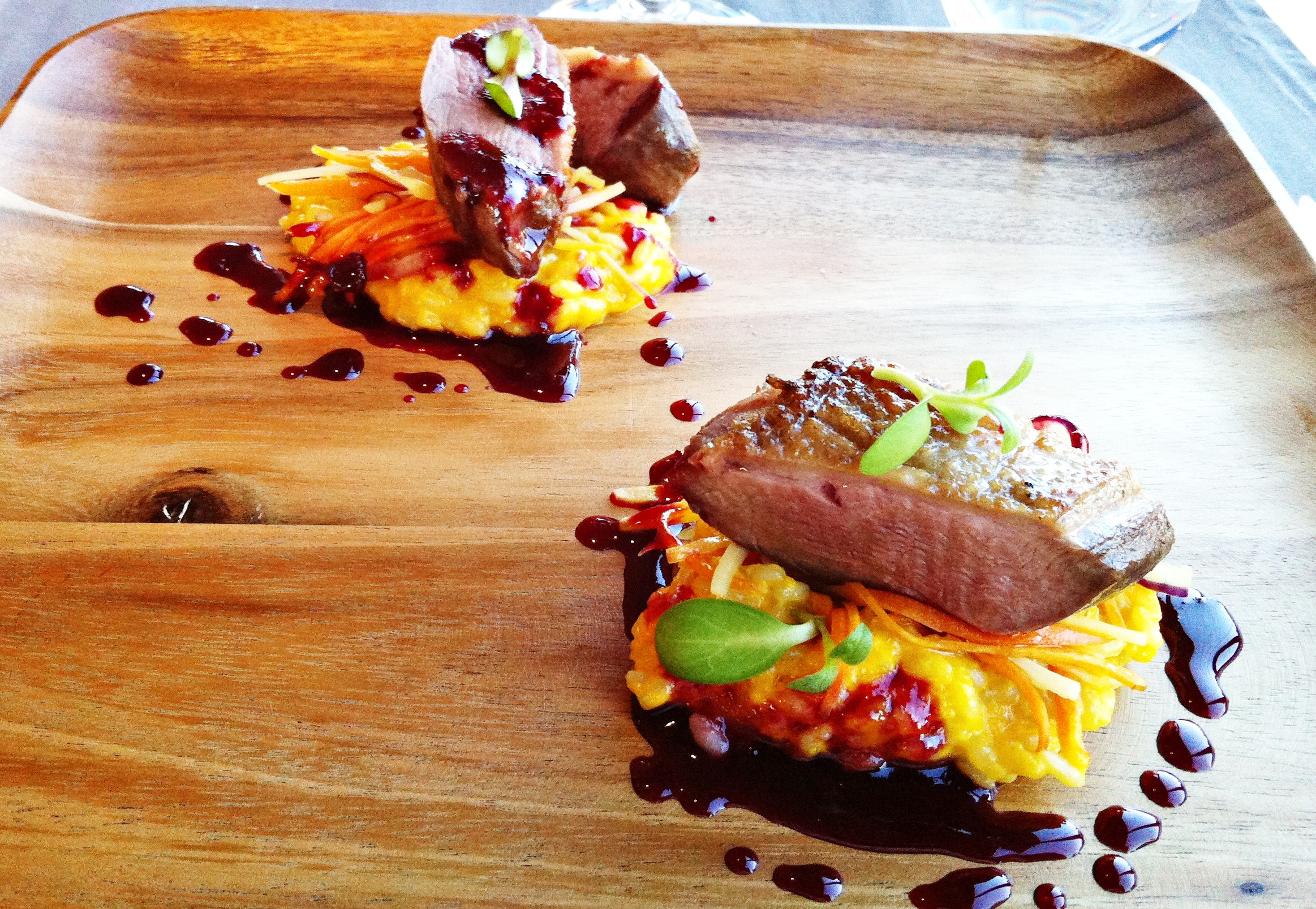 Myös hanhenrinta, sitruunaruoho, appelsiinirisotto ja kirsikka-cumberland hellivät makuaistia, vaikka hanhi olikin omaan makuuni aavistuksen verran liian kypsää. Appelsiinirisotto oli sen sijaan peräti erinomaista, samoin sen ménage à trois kirsikan ja hanhen kanssa oli mainio makunautinto. Viinipaketissa oli suunniteltu sama em. Donna Elena possulle ja hanhelle, mikä oli ihan jees – tuo sinänsä mainio viini ei ehkä kuitenkaan parhaalla mahdollisella tavalla tukenut kumpaakaan herkullisista liha-annoksista. Niinpä nautin lihat lihoina ja lipitin viinin erikseen 🙂