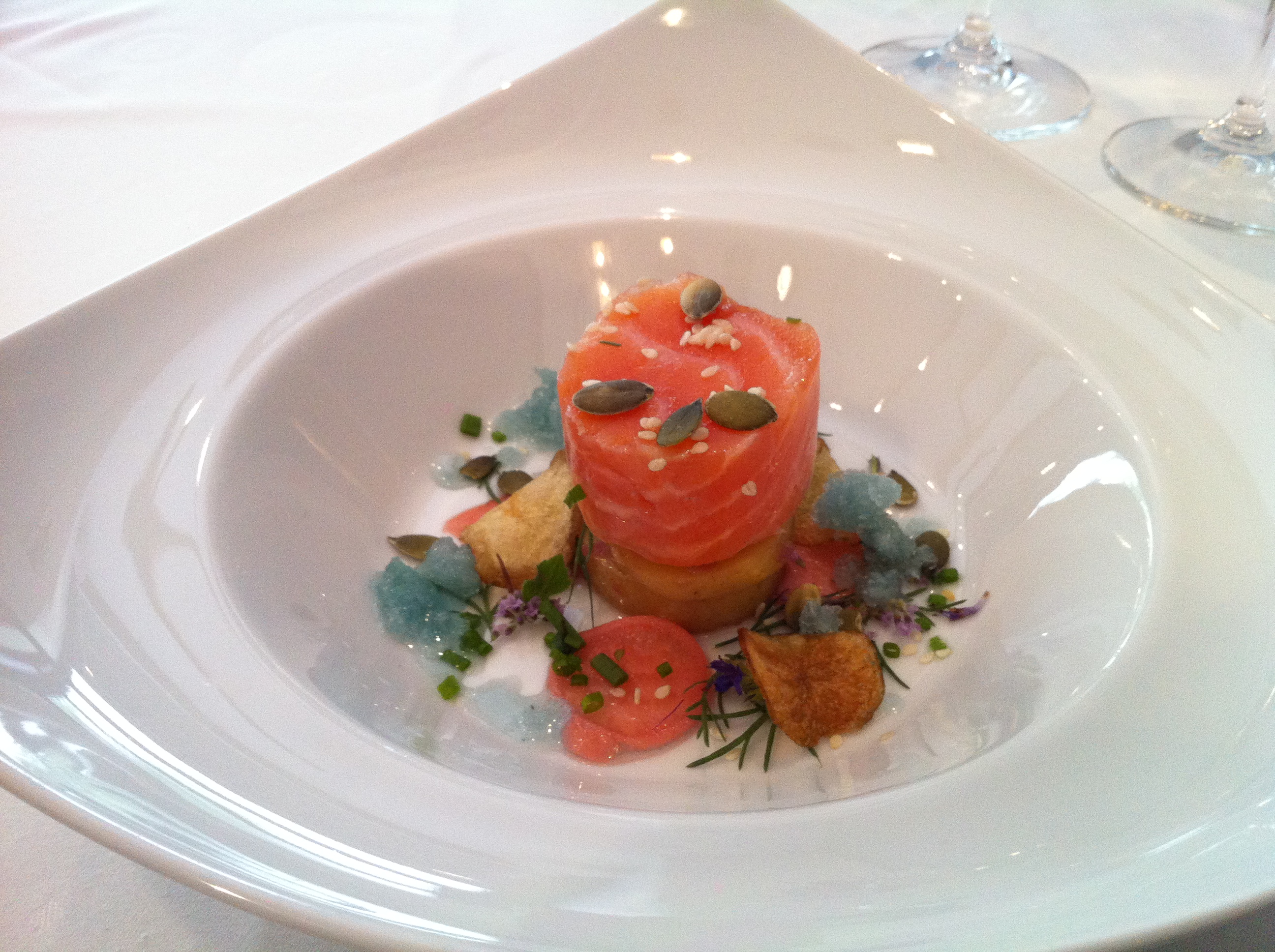 Toisena alkuruokana oli lohta muotoiltuna putkeksi ja aseteltuna perunaviipaleiden päälle muodostaen hilpeän tornin. Mukana myös pikkelöityä retiisiä, perunalastuja – ja merivesi-granitaa! Granita suli pian ”kastikkeeksi”. Hauska ja oivaltava annos, mutta oma makuhermojani ei ihan samoille nautinnon tasoille virittänut kuin edellinen tai seuraava. Georg Breuer GB Riesling Sauvage 2011 sopi hienosti lohelle jopa suolaisen ”kastikkeen” kanssa.