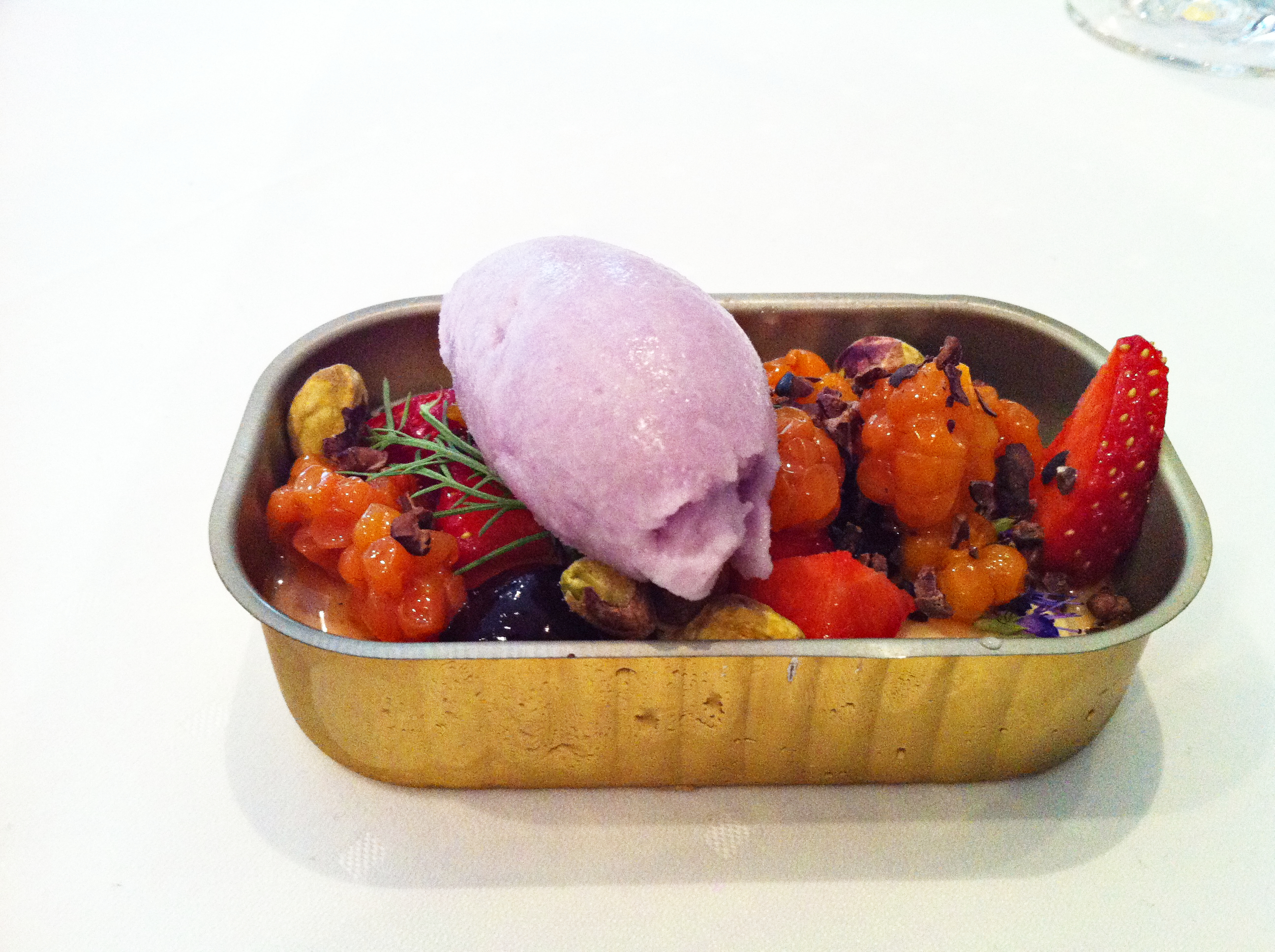Jälkiruoka oli koottu kivasti sardiinipurkkiin, jonka pohjalla oli valkosuklaa-lakka-pannacottaa, sen päällä mustikkageeliä nokareina, lakkaa, mansikkaa, pistaaseja ja kaiken kukkuraksi vielä laventelisorbettipallura. Kuulostaa vähän keräilyerältä, mutta hyvin sointuivat maut yhteen. Myös tässä oli viininä hiukan yllättävä valinta: kotimainen Rönnvikin viinitilan Viherherukkaviini, joka olin mainio kaveri etenkin lakalle eikä toki potkinut otsaan muitakaan komponentteja.