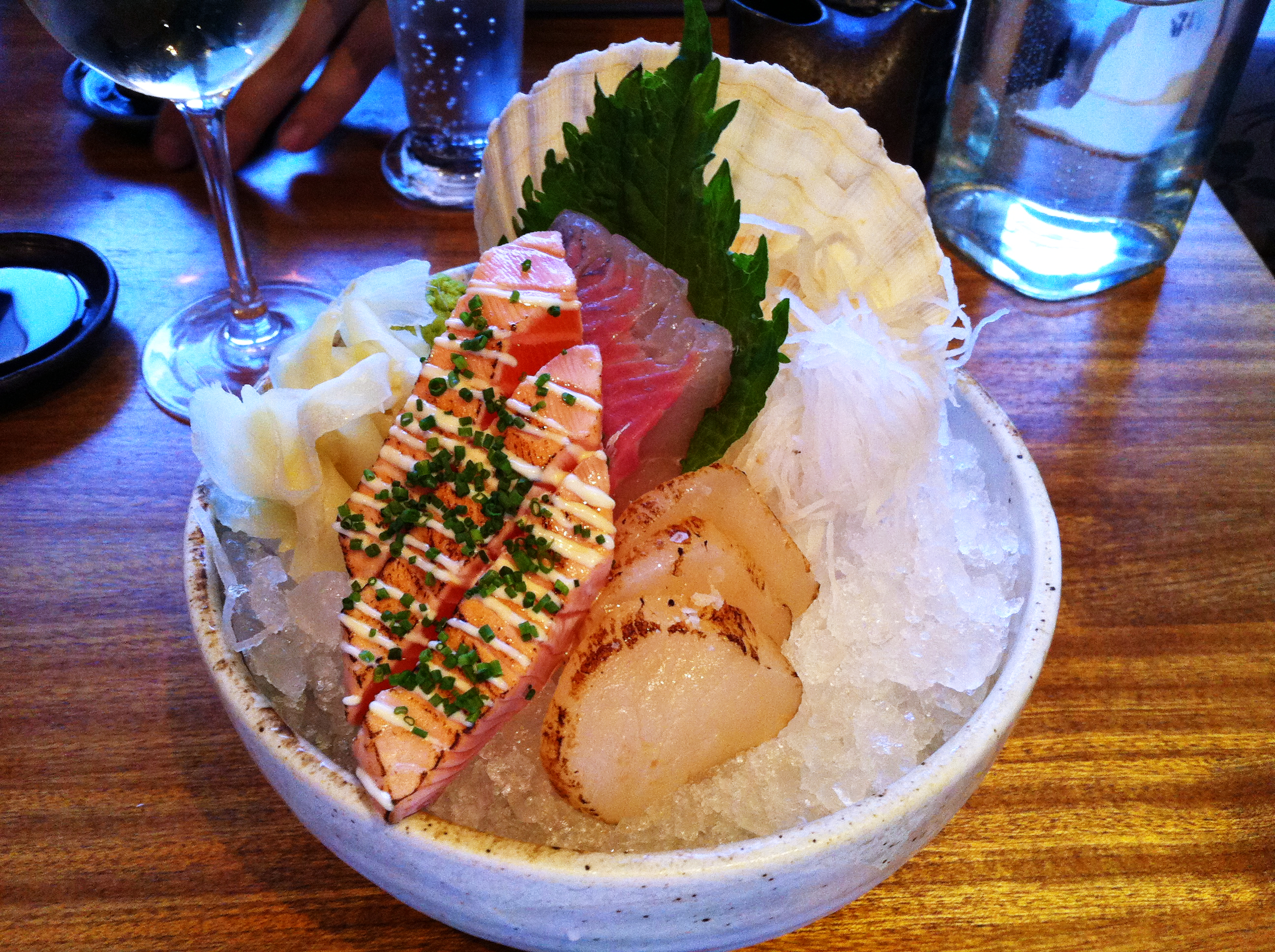 Varsinaisen sushin sijaan nautin mieluummin sashimia, ja Umeshussa kaikkia ”nigirejä” onkin saanut ”sashimeina”, ja niin lopulta nytkin vaikka tarjoilija tällä kertaa hiukan nikottelikin tilaukselleni: siikaa, grillattua lohta ja grillattua kampasimpukkaa. ”Grillattua” tässä tarkoittin hyvin kevyesti pinnalta kypsytettyä mutta muutoin raakaa. Sashimit tarjoiltiin kauniisti jäämurskakulhon päältä inkiväärin kera. Kaikki kolme olivat mitä mainioimpia – erinomaiset aidot maut, joita pieni pintagrillaus ja soijakastike hienosti korostivat. Juomana kaloille toimi hyvin itävaltalainen Loimerin raikas Lenz Risesling.