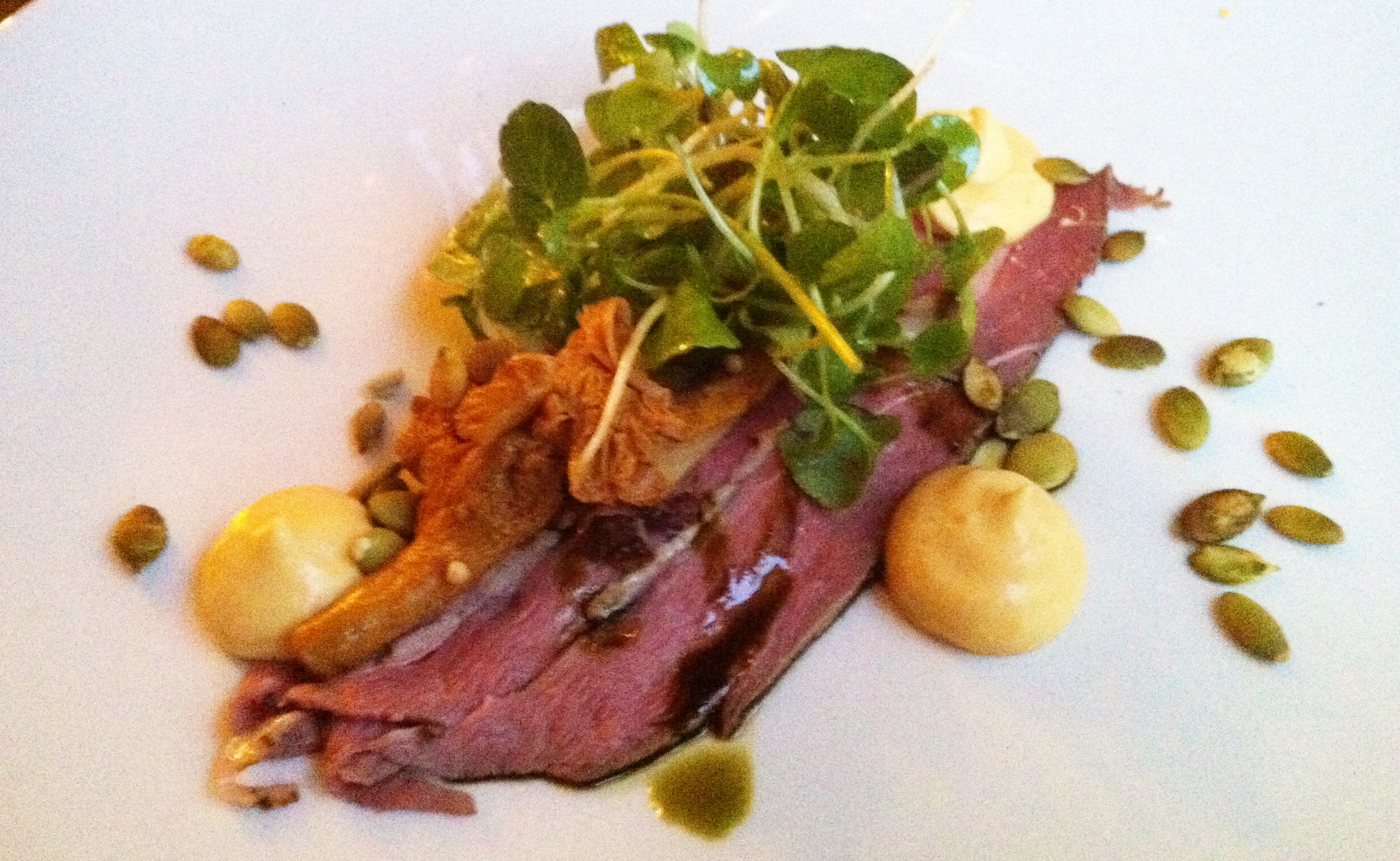 Alkuruoaksi saimme ankkapastramia kurpitsamoussen, kurpitsansiemenien ja pikkelöityjen kantarellien kera. Miedot mutta hyvät maut, ankka maistui mainiosti ankalle ja kurpitsalisäkkeet toimivat sen kanssa mukavasti. Saksalainen Shelter Wineryn vuoden 2011 pinot noir nosti linnun mukavasti siivilleen.