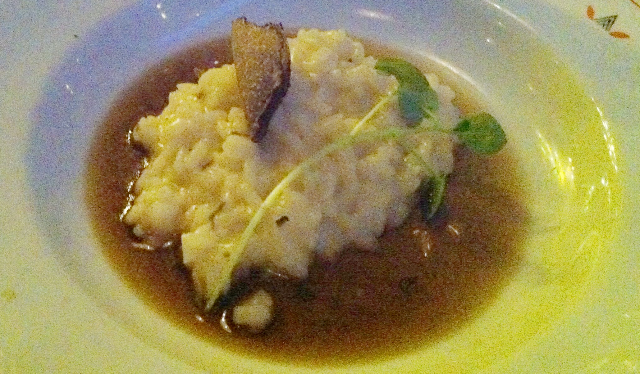 Joskus taannoin näillä Muru-keikoilla erehdyimme kokeilemaan välirisottoa, joka oli kertakaikkisen hurmaava, niinpä sen jälkeen se on aika lailla kuulunut aina ohjelmaan. Ja hyvä niin, tämänkertaisen tryffelirisoton skippaaminen olisi ollut melkoinen menetys: risotto oli nappisuoritus, kuten aina, ja tryffelinen liemi sen kanssa herkkua. Lasissa alsacelainen Gresser Moenchberg riesling säesti sujuvasti.