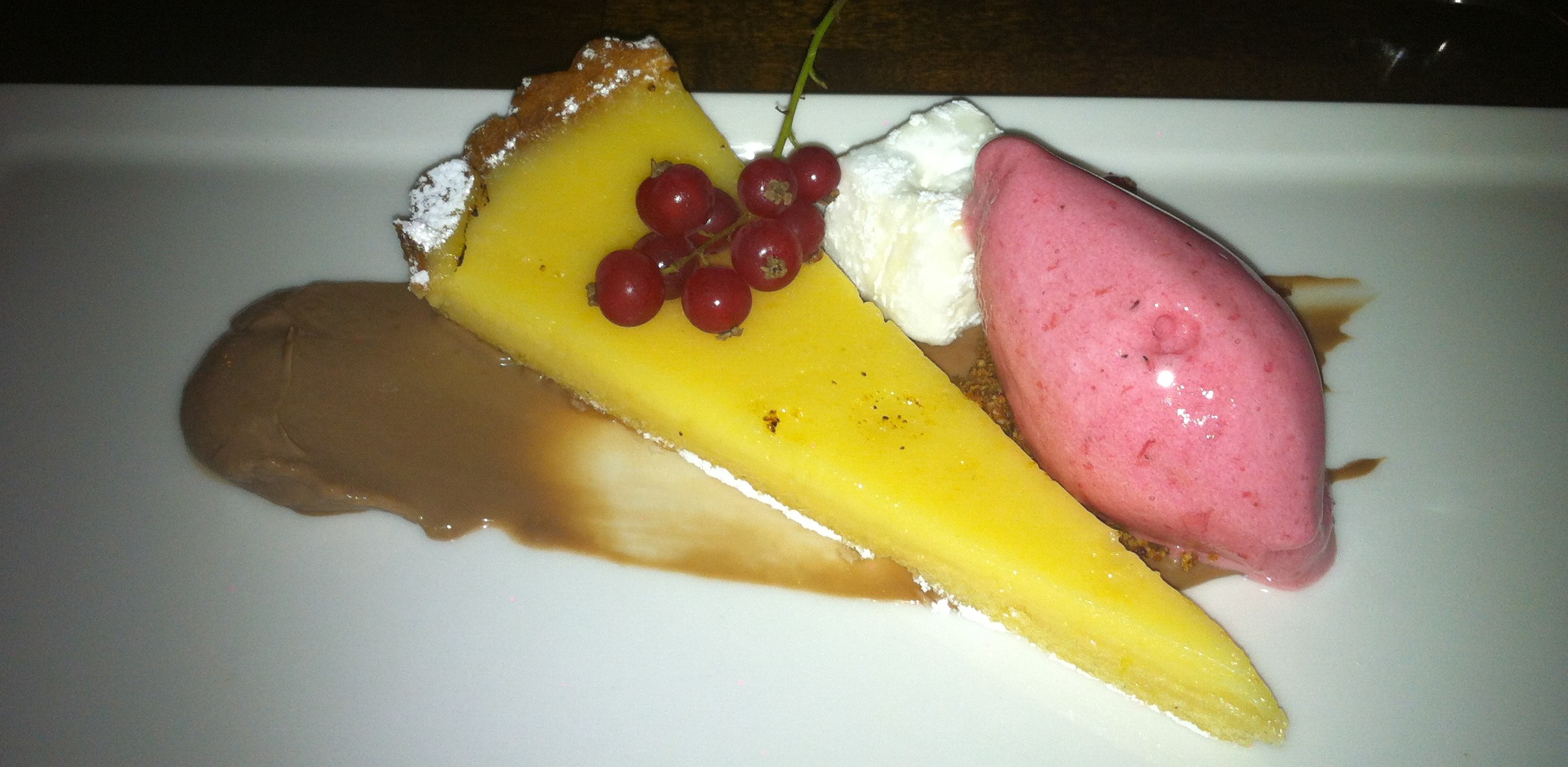 Jälkiruokana hiukan tylsän kuuloinen sitruunapiiras. Mutta vain kuuloinen: hento sitruunaisuus oli mainio alusta kokonaisuuden muille mauille: punaherukkasorbetille ja maitosuklaamousselle. Sopivan makea ja happoisa yhdistelmä, jolle lounaisranskalainen Plageolesin kukkaisenhunajainen ja riittävän makea Muscadelle 2011 sopi kuin nenä päähän.
