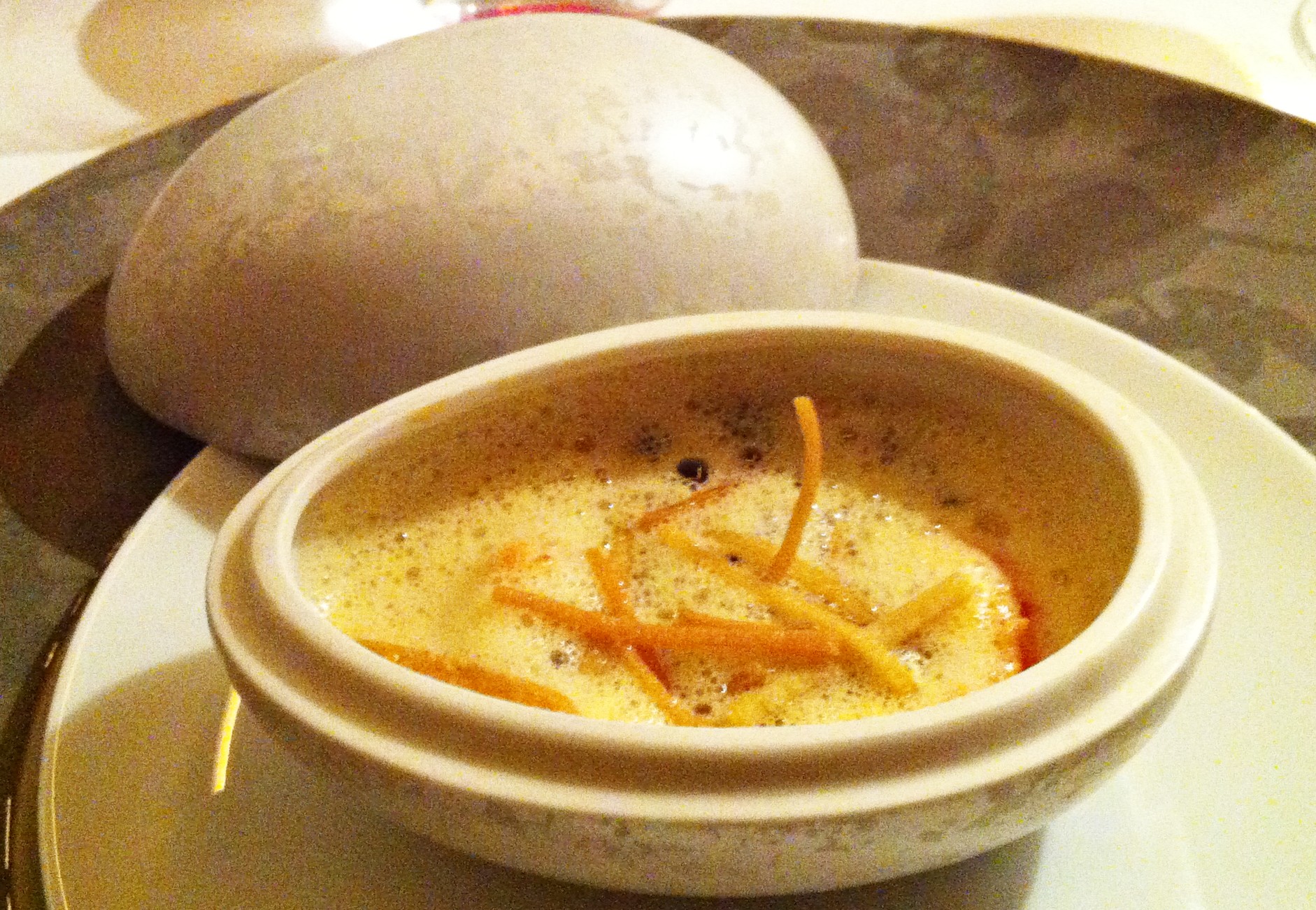 Varsinaista amusea ei em. palleroisten lisäksi tullut, vaan liikkelle lähdettiin ensimmäisellä annoksella, rapu-veloutélla, joka tarjoiltiin hauskasta keraamisesta munasta. Maku oli herkän rapuinen ilman häiritseviä ylimääräisiä sivumakuja (kuten tilliä, jolla rapuparka usein tärvellään), sen sijaan mustatorvisienet sopivat mukaan hienosti. Kastikkeen koostumus oli nimensä mukaisesti samettista, jota tosin rikkoivat muutamat julienne-kasvikset, jotka varmaankin olivat välttämättömiä, mutta joita ilmankin olisin kyllä kasvisskeptikkona tullut hyvin toimeen. Juomaksi sommelier, vaikkakin australialainen, toi uusiseelantilaista varsin mainiota Pyramid valleyn Malborough Rislingiä (2009),
