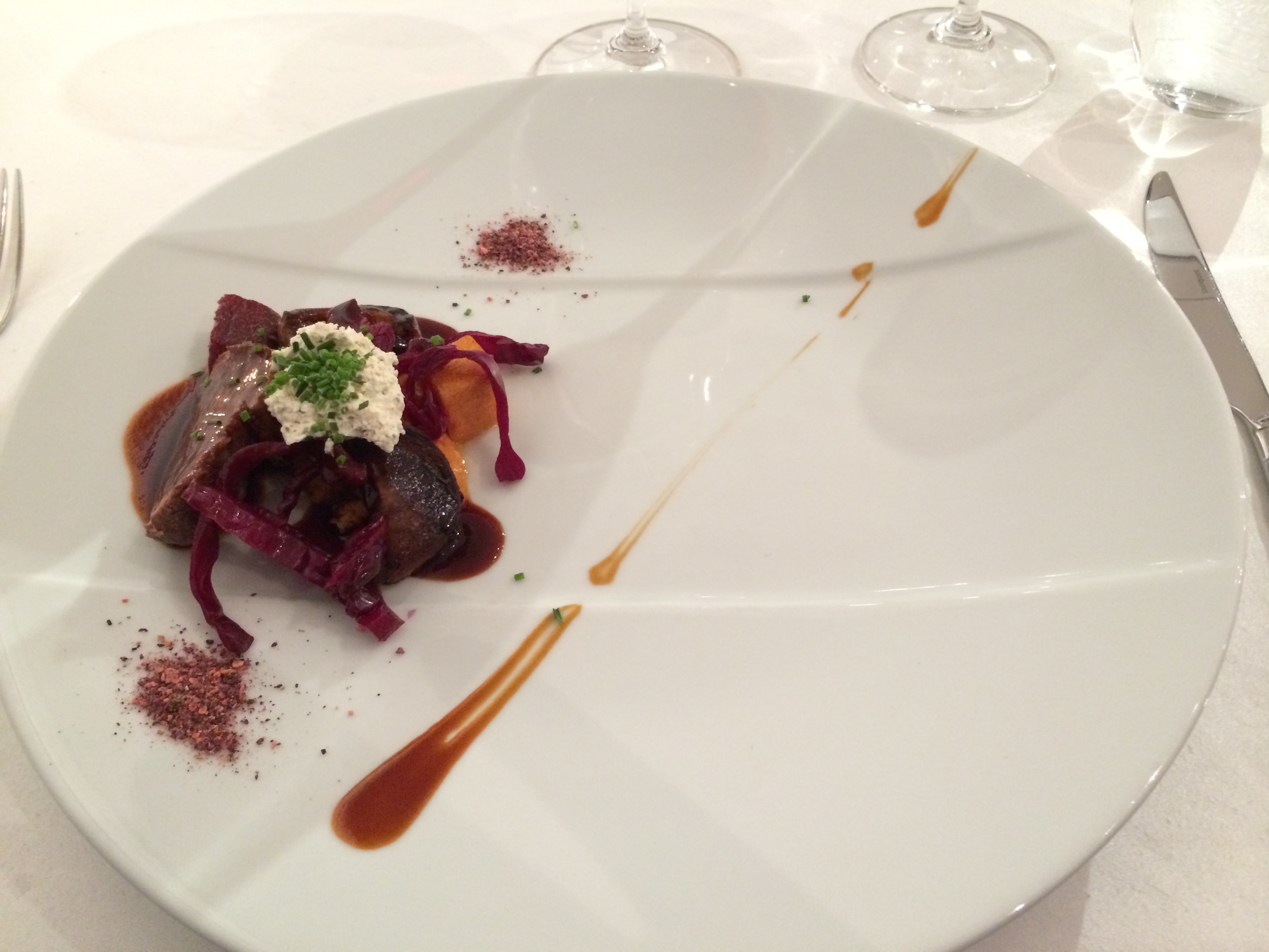 Ensimmäisenä pääruokana oli ”Varangerin turskaa ja sitruunaa”. Turska on kovin usein olematon maultaan, tässä sekin kuitenkin maistui, seuranaan sitrus-parsakaali-pyree sekä varsi-ja juuriselleriä. Komponentit olivat kaikki maukkaita, mutta omaan makuuni kasviskomponentit vähän dominoivat annosta etenkin määrältään. Eipä niitäkään toki tullut jätettyä syömättä eikä mielenkiintoista piemontelaista Castello di Neive Montebertotto Langhe Arneis’ta (2011) juomatta. Hyvä kokonaisuus, muttei erinomaisen tasolle yltänyt.