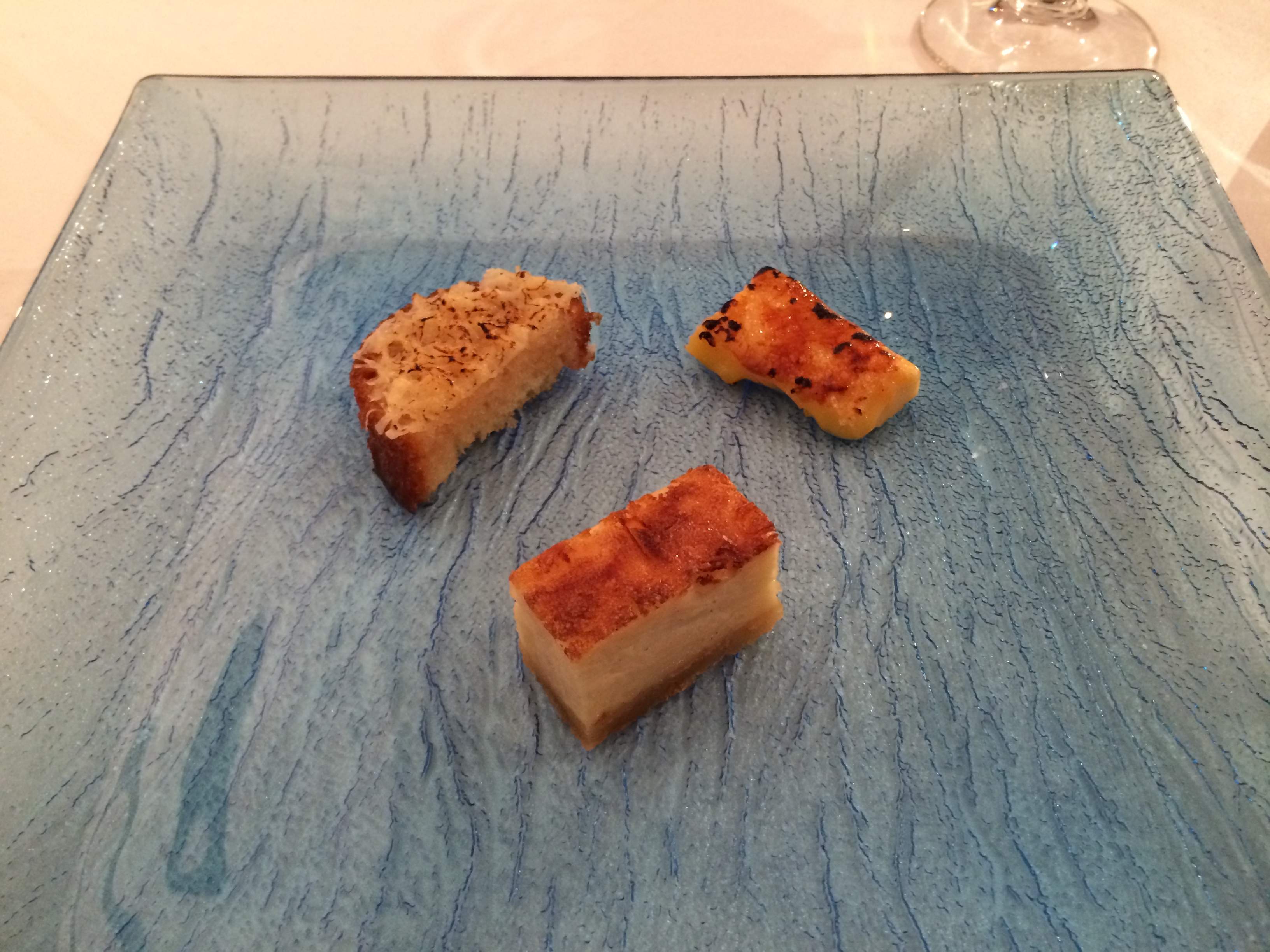 Ensimmäinen alkuruoka oli nimeltään ”maa-artisokkaa ja omenaa”, mukana maa-artisokkaa, omenaa, rusinaa, rakuunaa erilaisissa muodoissa ja monenlaisina tekstuureina, maukas annos. Viininä alsacelaista pinot blancia, jonka maussa oli aavistus makeahkoutta ja aromaattisuutta – vähän ehkä hennohko viini, joka omaan makuuni vähän ehkä latistui ruoan hapokkaiden omenien rinnalla. Muttei toki huonokaan yhdistelmä.