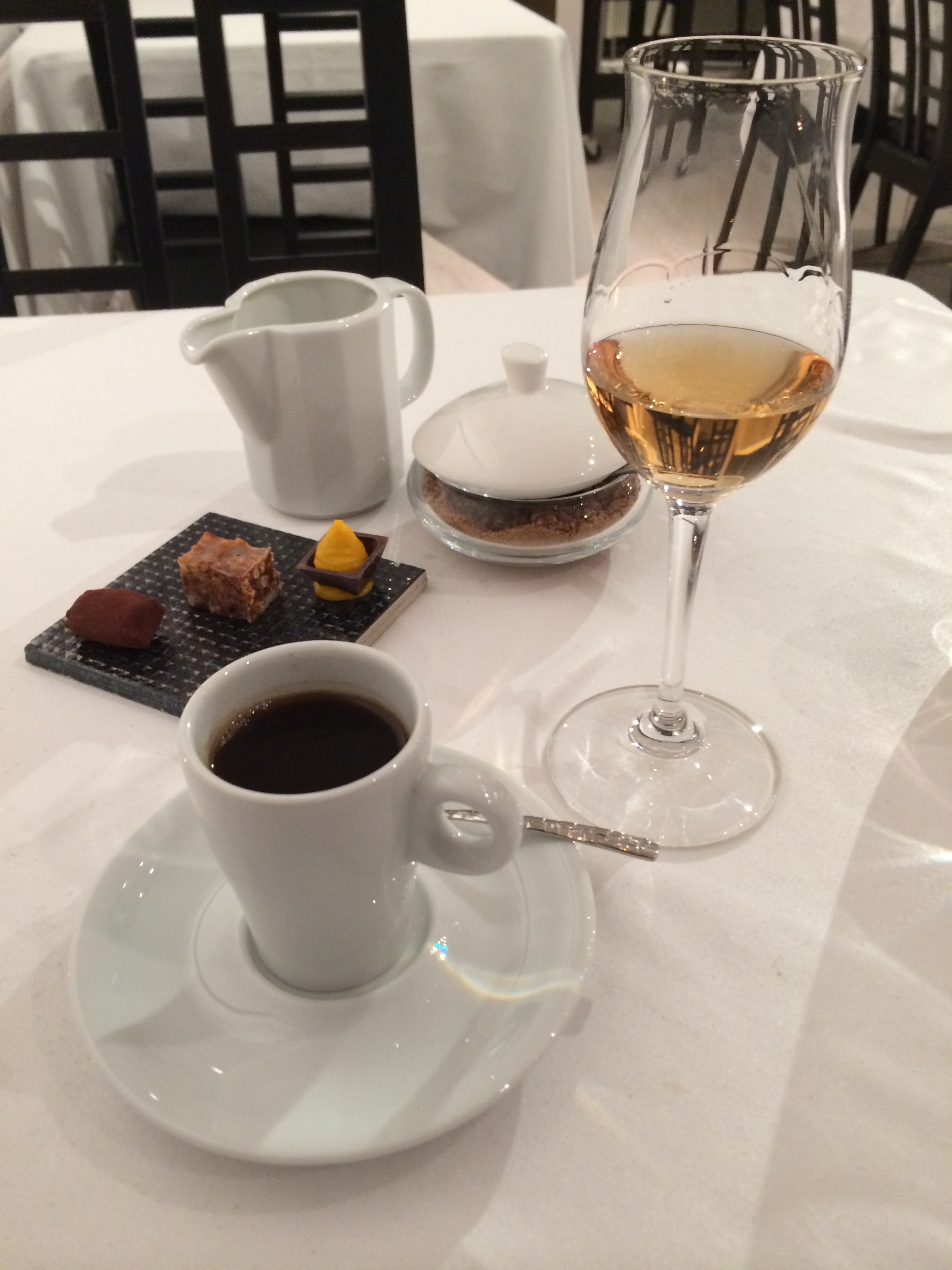 Joskus vielä näkee noudatettavan sitä vanhaa muodollista periaatetta, että jos menun edetessä mennään punaviinista valkoviiniin (ja lihasta kalaan), suu olisi hyvä välissä raikastaa esim. pienellä granitalla tms. Makuaistin perusteellisempi resetointi edellisen voimakasmakuisen liha-annoksen jälkeen olisi voinut olla hyväksi tässäkin.