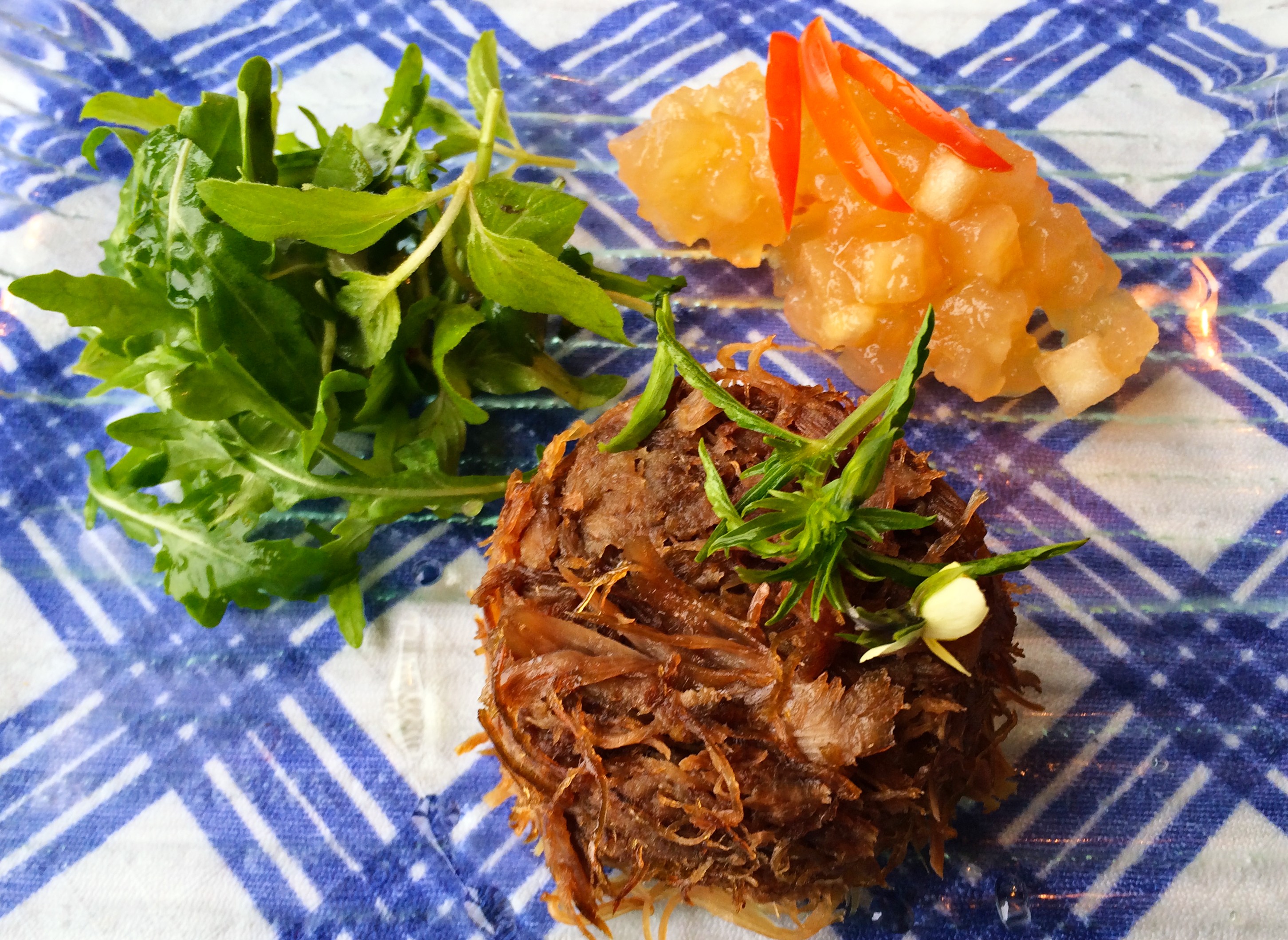 Alkuruoaksi useimmat porukastamme ottivat Sirpalesaaren salaisuuden, jossa oli kymmenkunta pikkukipollista erilaisia suolapaloja: sillejä, sienisalaattia, perunaa, ankkaa, peuraa, lohta, jne. Itse valitsin Ålvadoksella maustettua ylikypsää ankkaa, jonka kanssa tarjottiin omenahilloketta. Ankka oli vähän rilleten tai nyhtömeiningin oloista, oikein mureaa ja maukasta – Ålvadosta tosin en sieltä juuri löytänyt, mutta omenahillokkeen kanssa se toimi täydellisesti, paremmin kuin vastaava mutta Ålvadokseton ankka, jota muiden kupposissa oli.