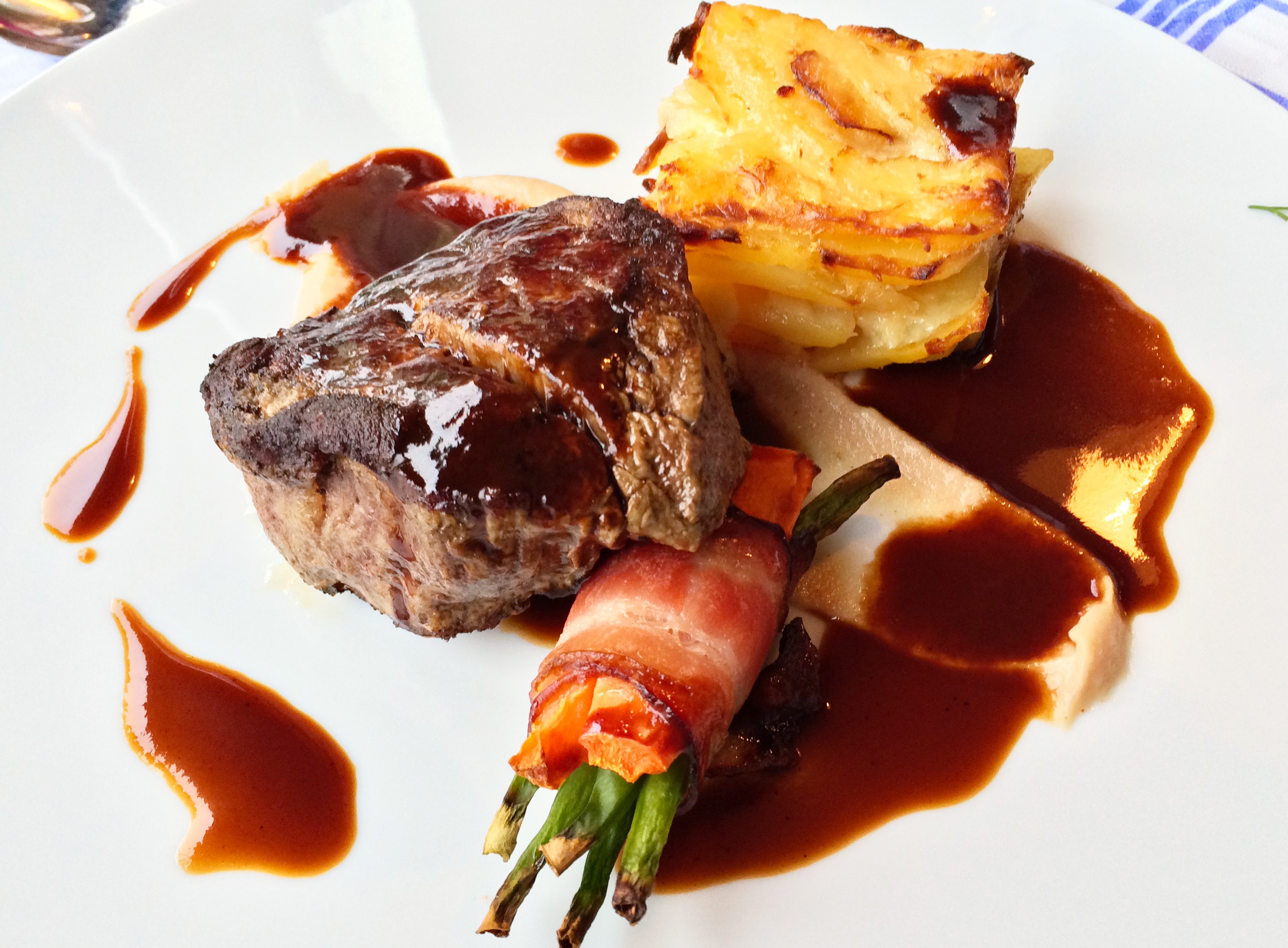 Pääruoaksi muut ottivat päivän kalaa (kuhaa), minun valintani poikkeavana yksilönä oli härän sisäfileepihvi Saaren tapaan, seuranaan peruna-valkospulipaistosta, pekoni-sipulipyreetä, tummaa ryvässipulikastiketta sekä pekoniin kääräistyjä papuja ja porkkanasuikaleita. Olipa mainio tapa saada typötylsiin vihanneksiin hyvää makua: sujauttaa ne pekonikäärön sisään! 😉 Pihvi oli esimerkillisen hyvin paistettu, murea ja erinomaisen maukas, samoin pekoni-sipuli-pyree oli varsin huikeanmakuista eikä perunapaistoksessakaan mitään vikaa ollut. Ei ehkä suuria pisteitä annoksen luovuudesta, mutta hurmaavan herkulliset maut! Viiniksi suositeltu australialainen Rolling Shiraz oli ihan pätevä shiraz, vaikkei mehukas ja makosia annos viintä niin suuresti kaivannutkaan.