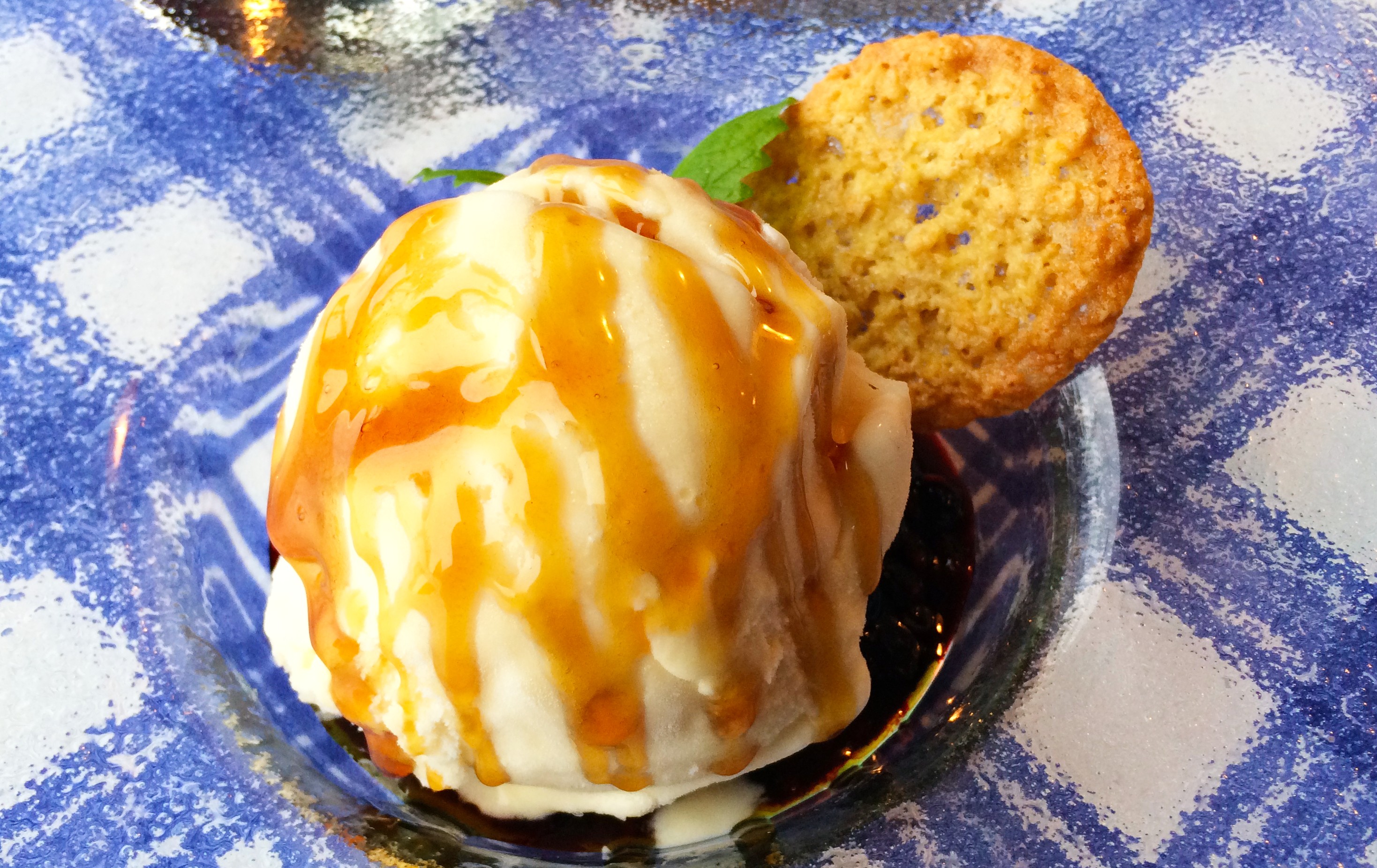 Myös jälkkäriksi otin ravintolan klassikkoa eli Saaren perinteistä tervajäätelöä, sen kanssa hilloa vadelmista ja mustikoista, tervasiirappia ja kaurakeksi. Keksi oli turha mutta ihan jees, sen sijaan jäätelön hienoinen tervanmaku oli hieno tuttavuus – ja yllättävän hyvin siihen sopi kuningatarhillo. Vielä suurempi yllätys oli, että tervalle ja muille mauille löytyi täydellisen hyvin sopiva viini: Lepaan viinitilan Mamsellin makea viherherukkaviini! Jonkin verran olen maistellut kotimaisten marjaviinitilojen tuotteita, ja ”punaviineistä” en oikein muista löytäneeni irvistämättä juotavaa, mutta ”valkoviineistä”, etenkin makeista valko- ja viherherukkaviineistä, on löytynyt hyvinkin suunmyötäisiä tuotteita (likööreistä ja tisleistä puhumattakaan). Tässä taas yksi sellainen, itselleni uusi, miellyttävä tuttavuus.