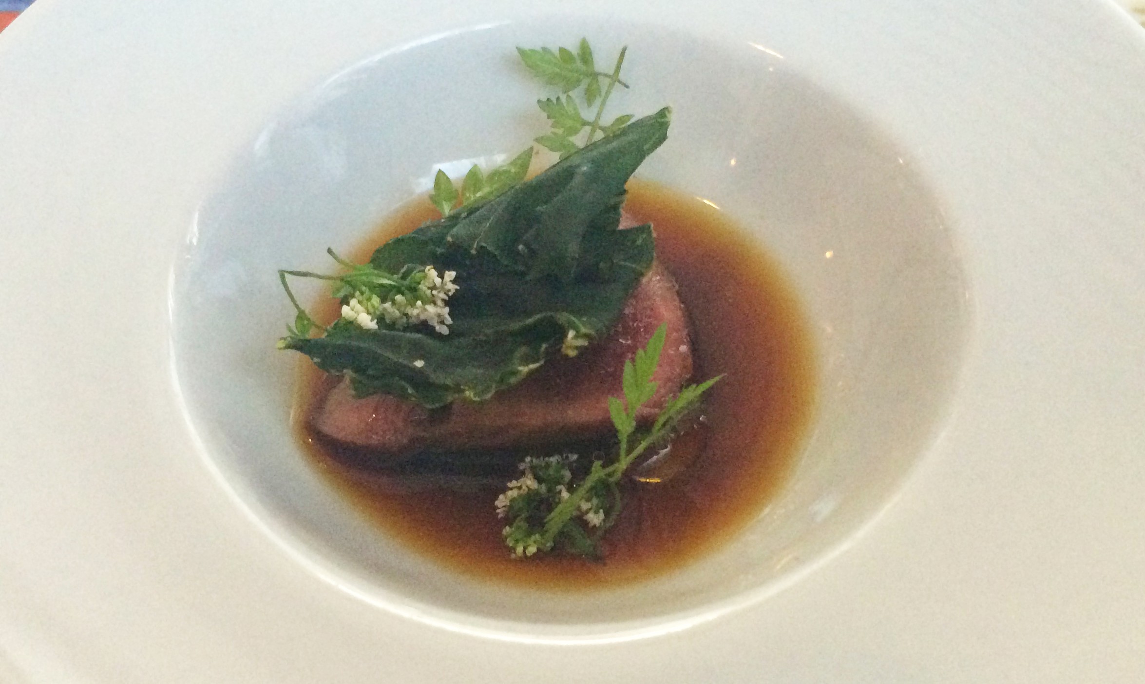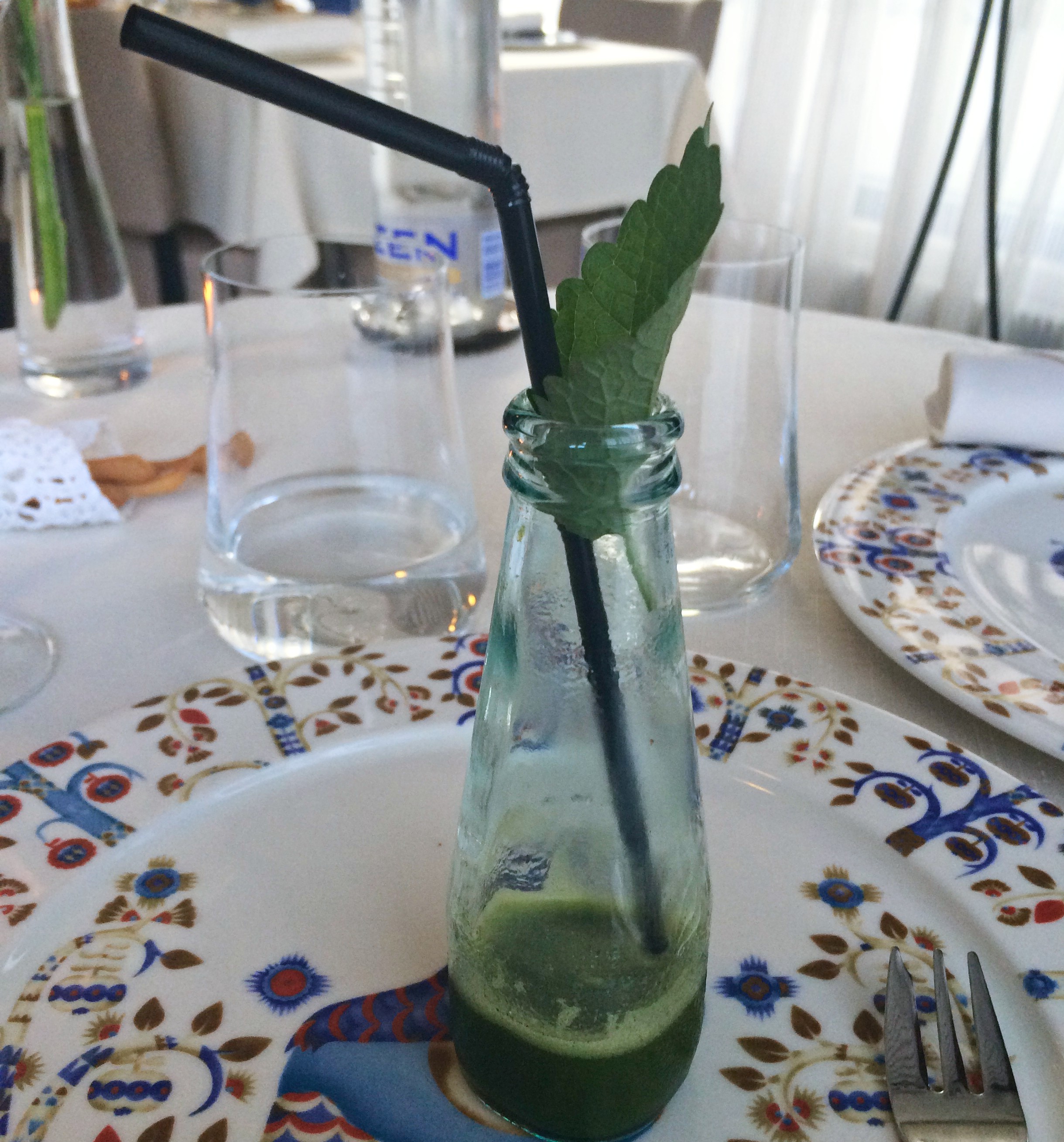 Toisena oli juotava amuse: upean myrkynvihreä vuohenputkikeitto. Vahvasti luonnonyrtiltä maistuva keitto ryystettiin pillillä, jolloin pullon sulle asetettu sitruunamelissan lehti antoi nenän kautta oman hienon aromilisänsä makunautintoon. Hauska ja toimiva keksintö!