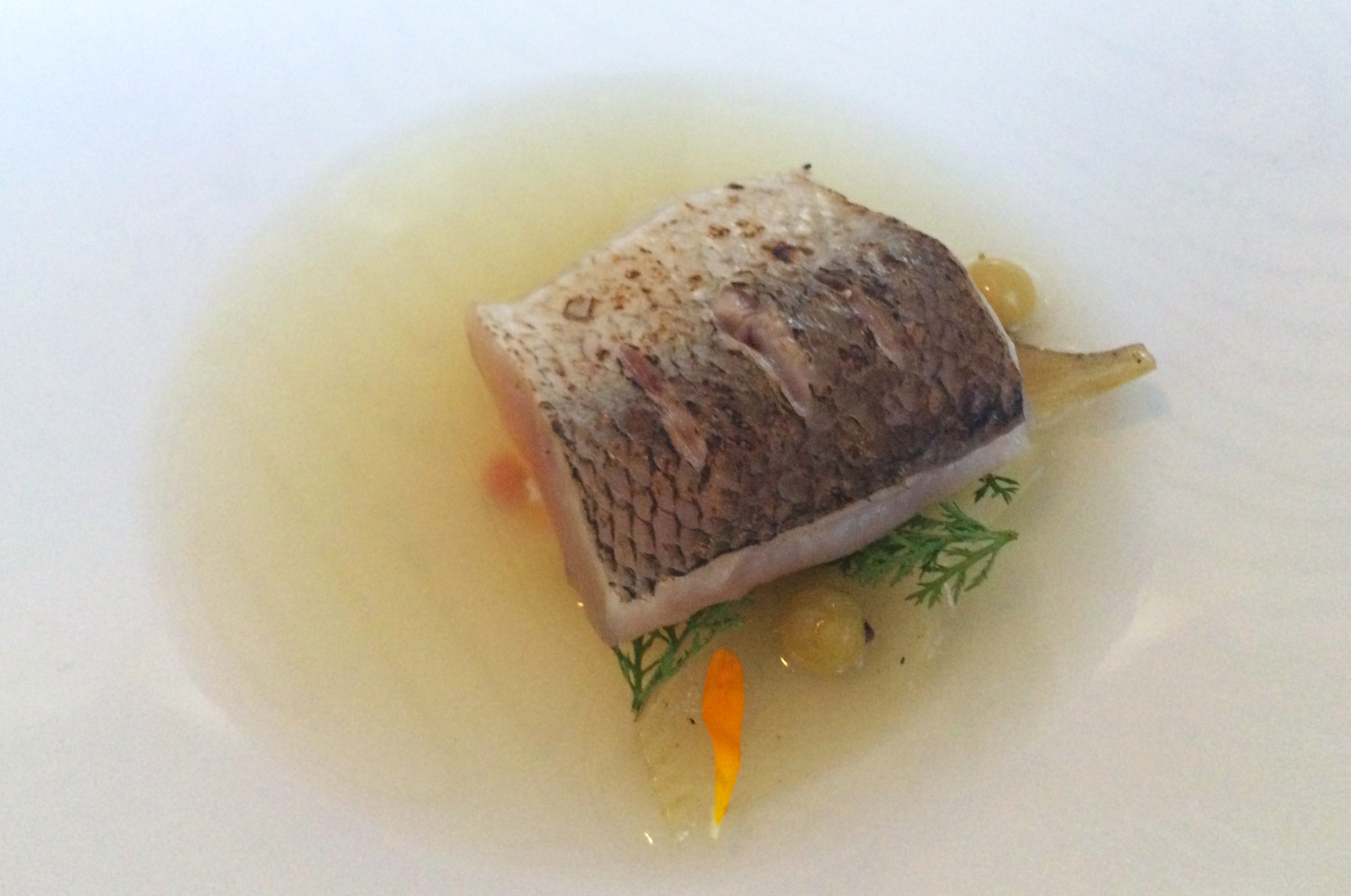 Seuraavaksi oli vuorossa varsinaisen menun ensimmäinen ruokalaji, jääkellarin siikaa sipulin ja fenkolin kera. Pyhäjärven siika oli marinoitu suola-sokeri-liemessä, jossa oli ollut myös fenkolin siemeniä. Kala tarjoiltiin hauskasti: Christina paahtoi sen kevyesti tohottimella pöydässä puupalan päällä ja asetteli sitten lautaselle kasvisten päälle – ja kaatoi vielä ympärille fenkolilientä puukiposta. Muina komponentteina oli ainakin tillikermaa, keltuaiskreemiä, haudutettua sipulia ja fenkolia sekä raakana pomittuja ja marinoituja punaherukoita. Erittäin maukas annos, jossa harmonisesti hyvin yhteensopuvat maut, joille lasiin kaadettu luomu-gewürztraminer Domaine Begude Le Secret du Sud (2013) sopi aromaattisuudessaan mainiosti.