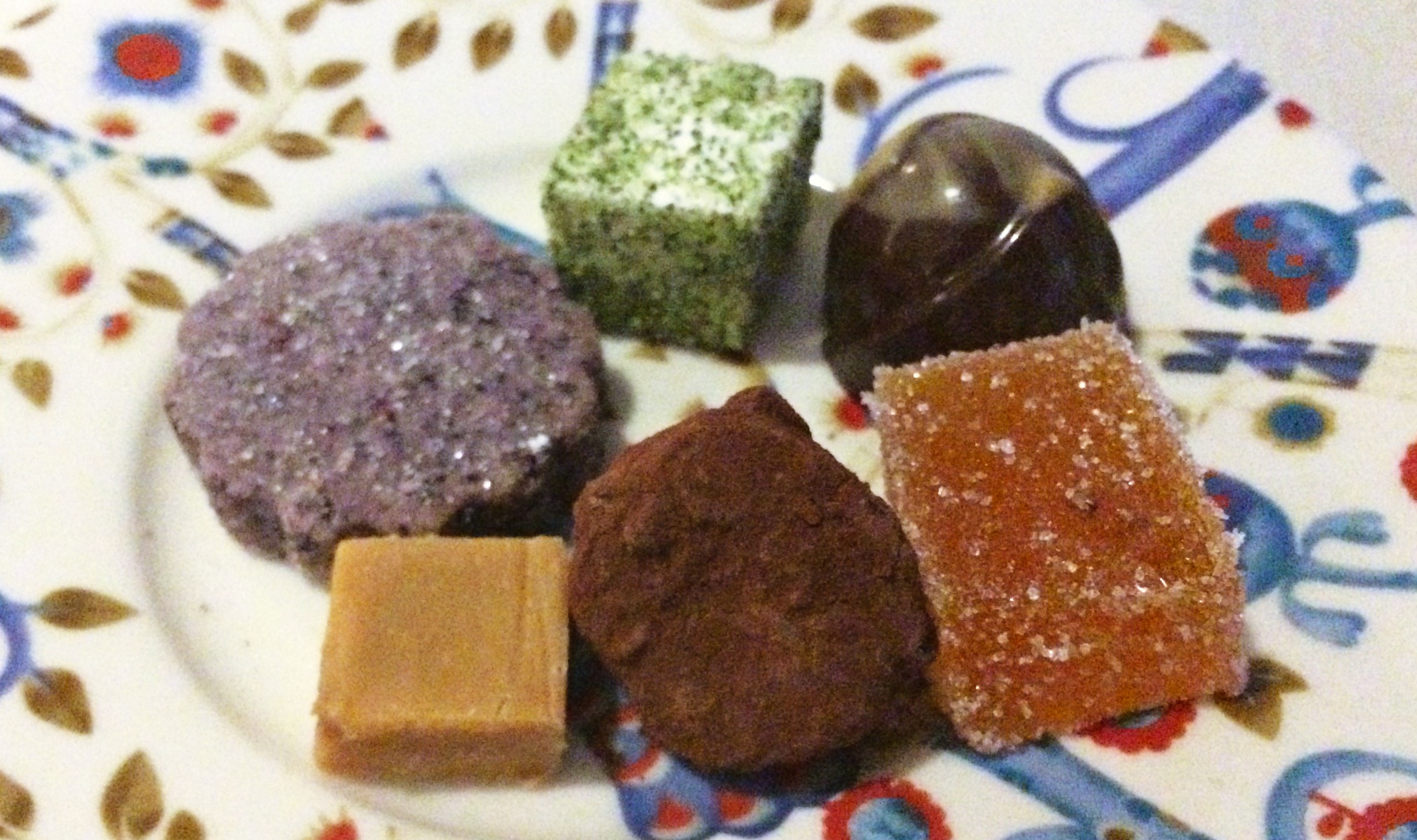 Espresson kaveriksi pyysin tapani mukaan jotain outoa ja erikoista. Hetken arpomisen jälkeen sain valittavakseni kaksi C:n omaa uutosta: tomaatti-karpalo-likööri ja mesiangervolikööri. En osannut päättää, joten Matti toi pari senttiä molempia 🙂 Tomaatti-karpalo oli pehmeän makeanraikasta, lähes jälkiruoka sellaisenaankin. Mesiangervossa aromaattisuus korostui makeuden yli, ja se toimi ehkä siksi paremmin avecina kahvin kera. Erittäin onnistuneita tuotoksia molemmat, vailla teollisten kotimaisten liköörien alkoholin ja sokerin päällekäyvyyttä. Kahvin kanssa sain vielä valikoiman pieniä herkkuja: marmelaatia, vaahtokarkkia, suklaakonvehtia, tryffeliä… juuri sellaisia makeita, joita kahvin ja digestiivin kanssa mieluusti aterian lopuksi aina toivonkin.