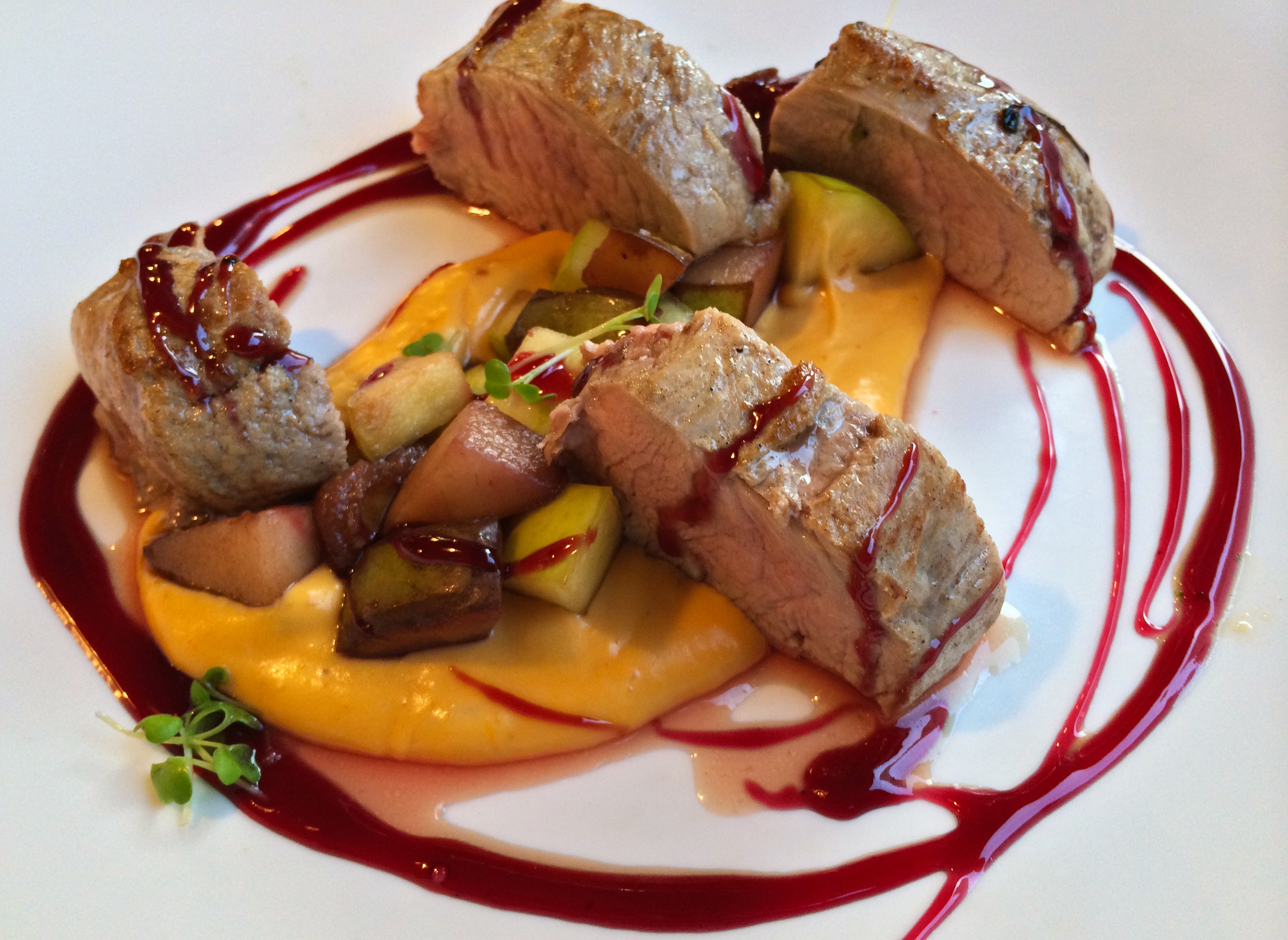 Pääruoaksi otin porsaan sisäfilettä, jonka kanssa tarjottiin omenaa, päärynää, kurpitsapyreetä ja Cumberlandin kastiketta. Erittäin pehmeässä possussa oli hyvin mieto possun oma maku, jolle omena ja päärynä olivat varmat kaverit kastikkeen tuodessa pientä terää. Kokonaisuus, kun kaikkia komponentteja makusteli yhtäaikaisesti, oli erinomaisen hieno. Lasiin kaadettu Monte dall’Ora Camporenzo Valpolicella Classico Superiore oli myös hyvin maukasta ja helli myös annoksen herkkiäkin aineksia.