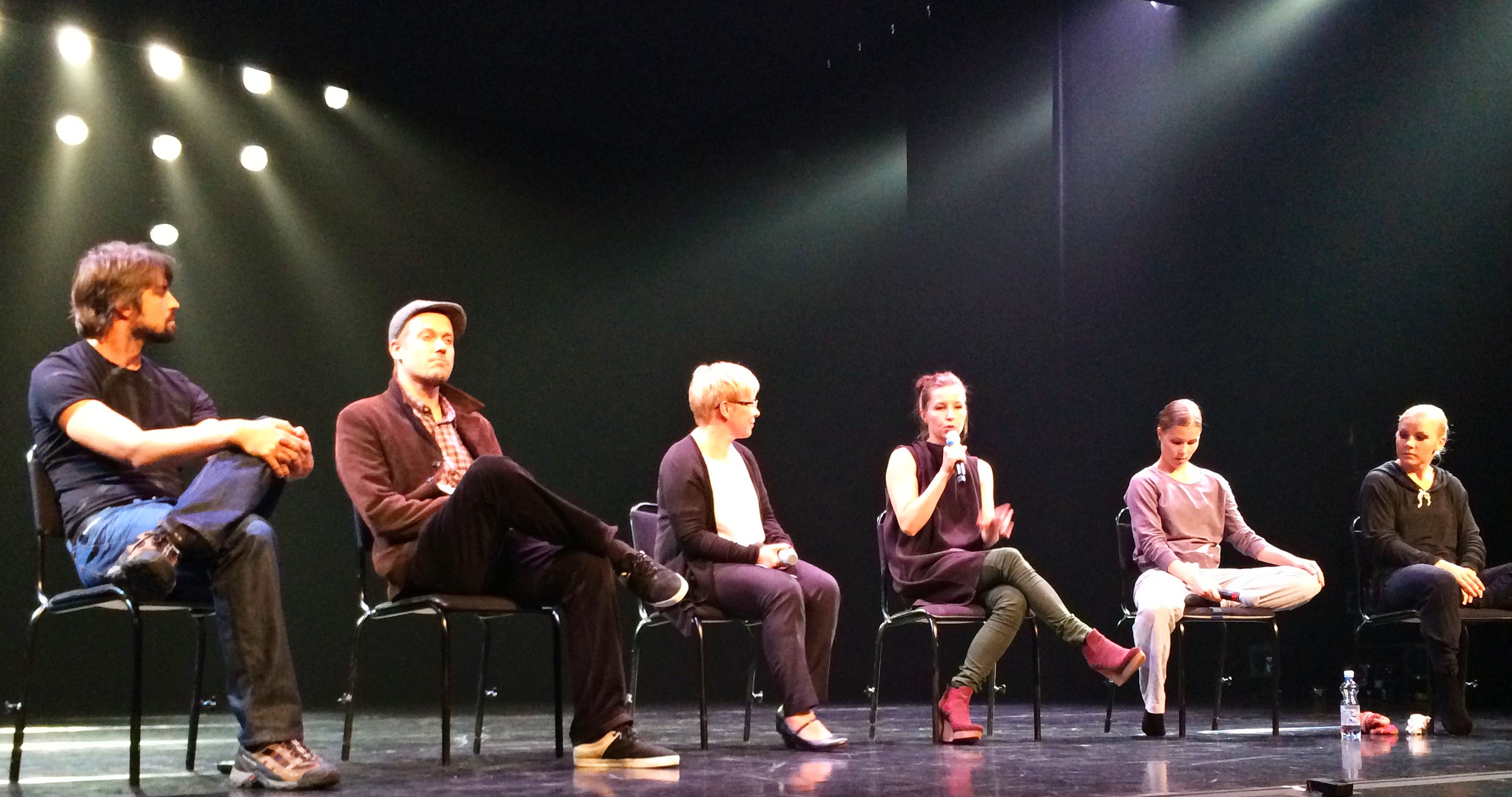 Keskutelussa esityksen jälkeen: Jouka Valkama (videot), Kasperi Laine (musiikki), Pirjetta Mulari (keskustelun puheenjohtaja, Tanssin tiedotuskeskus), Susanna Leinonen (koreografia) sekä Sanni Giordani ja Aksinja Lommi (tanssi)