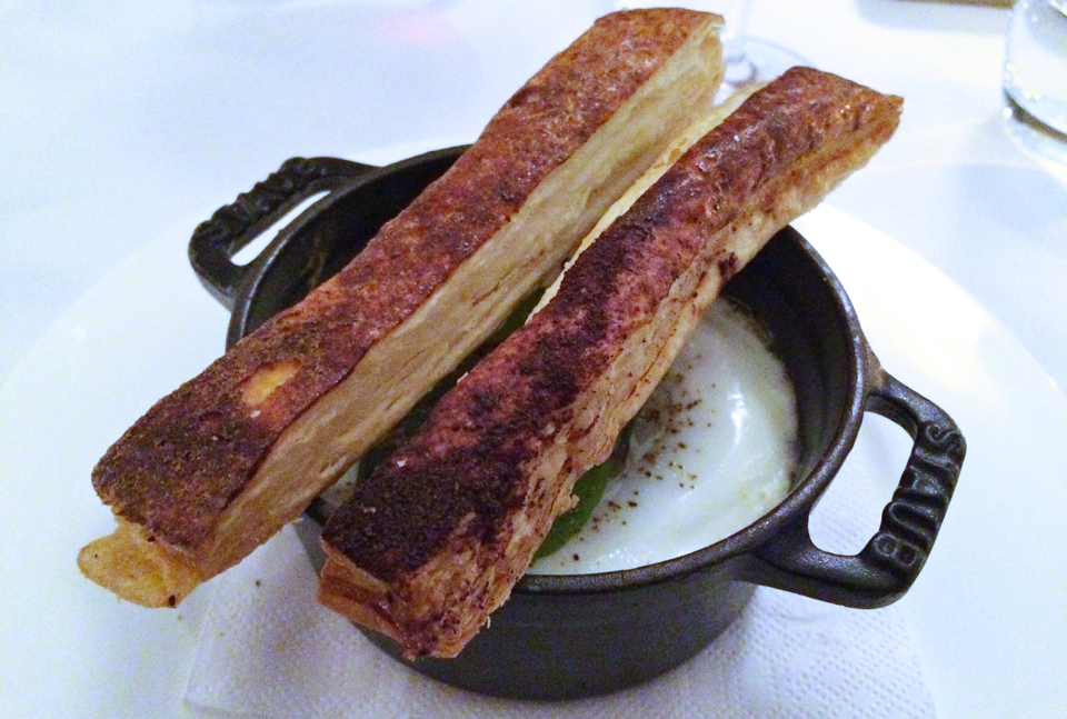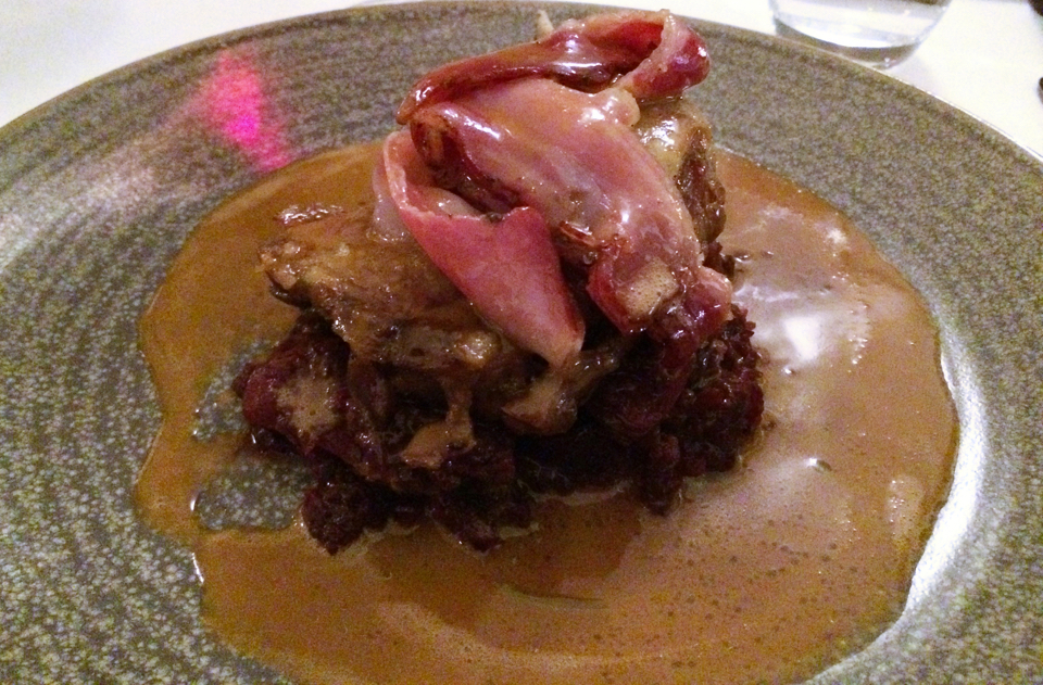 Alkuruoista löytyi hauskasti nimetty tattikokotti. En muista kokotti-sanaa aiemmin nähneeni pientä annospataa tarkoittavan cocotte-sanan suomennoksena – ”kokotti” ainakin omassa kielenkäytössäni on vakiintunut tarkoittamaan jotain ihan muuta. Tältäkään kokotilta ei puuttunut munaa, joka oli kauniisti hyytyneenä kantena todella herkullisen ja vahvasti tatin makuisen muhennoksen päällä. Hyvin lehtevät leipätikut täydensivät annoksen. Alkuruokien kanssa yhteiseksi viiniksi valittu melko kevyt mutta maukas pinot noir, burgundilainen Chassagne-Montrachet Rouge 1er Cru Clos Saint-Jean 2011, toimi tatin kanssa eittäin hyvin.
