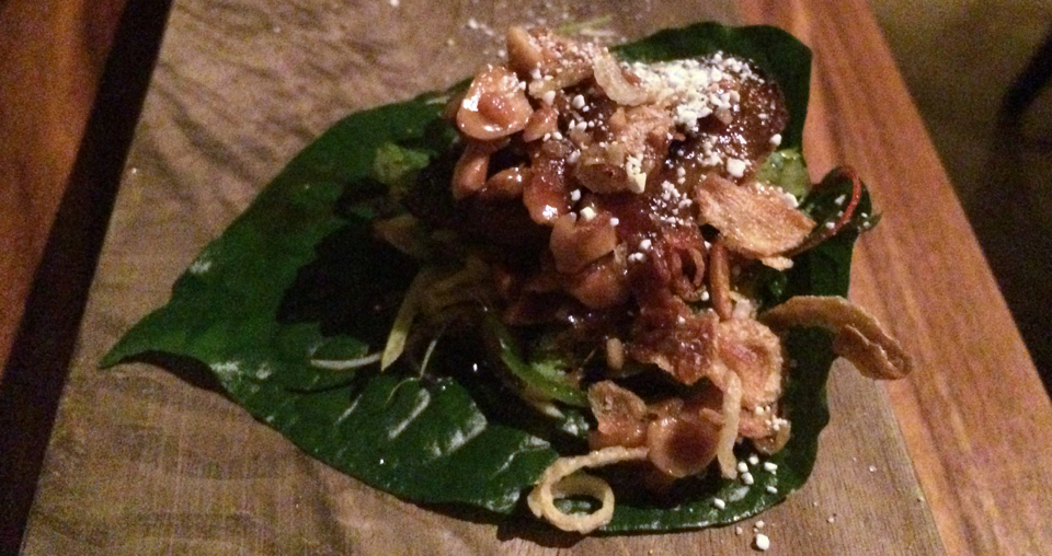 Seuraava suupala oli cha plu -lehteä ja grillattua Farangin makkaraa palmusokeri-maapähkinä-dressingin kera. Pienen sorminäppäryyden avulla täytteen sai pyöräytettyä lehden sisään ja napattua suuhun, jossa se olikin tervetullut herkku – mahtavan hienot maut, jotka sopivat keskenään yhteen koko lailla täydellisesti! Myös viini, sama Farang White, toimi makupalan kanssa mainiosti yhteen.
