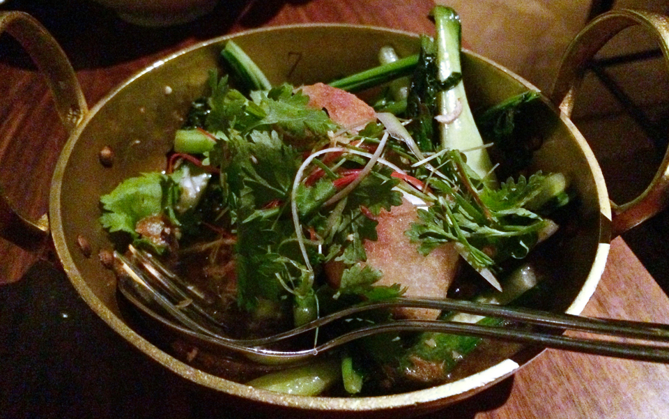 Kolmas annos oli salaatti paahdetusta lohesta ja vesimelonista, menossa mukana myös tuoretta banaaninkukkaa, papaijaa, paahdettua salottisipuli-tamarindi-dressingia, marinoituja katkarapuja ja paahdettua kookosta; tarjolle tuotiin myös thai-jasmiiniriisiä. Ihan jännä salaatti, mutta ei oikein herättänyt suuria tunteita suuntaan eikä toiseen. Lohi katosi muuhun makumaailmaan, nimiraaka-aineista vesimeloni sentään erottui edukseen. Viini, edelleen sama Farang White, ei oikein saanut kontaktia ruoan makuihin.