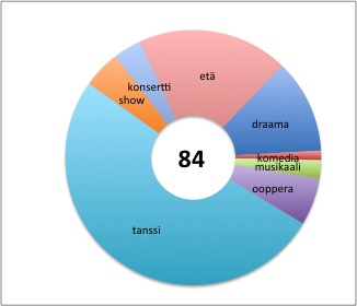 Rahtusen verran yli puolet, 43, kaikista esityksistä oli ”lähi-live”-tanssiesityksiä, näistä ehkä kolmasosa balettia ja loput nykytanssia (jos nyt tällainen kahtiajako on järkevä edes). Tanssin osuus on viime vuosina pyörinyt 30-50 % välillä, nyt taisi olla all time high. Seuraavaksi suurimmat kategoriat ”lähi-liven” osalta olivat draama ja ooppera; kevyemmät jutut eli musikaalit, komediat ja sekalaiset viihdyttävät showt, joilla vielä kymmenen vuotta sitten oli suuri rooli listallani, kattoivat viime vuoden saaliista enää vain kymmenyksen.