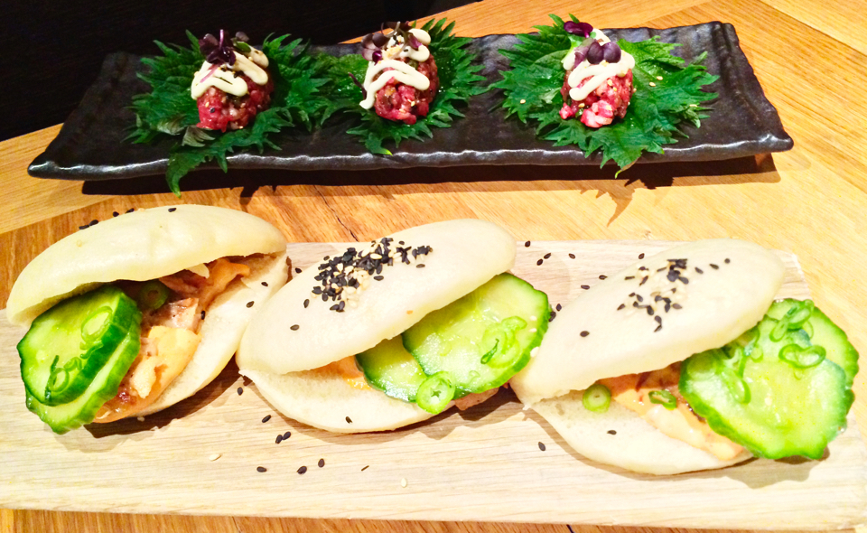 Snacks-listalta valitsimme kaksi: Beef tartar shizo & wasabi (häränlihatartar shiso-lehdellä, wasabimajoneesia, japanilaisia pikkelöityjä kasviksia) ja Pork bun (possunkylkeä, kimchi-majoneesia, pikkelöityä kurkkua, pehmeää leipää). Tartar oli huikea makupala: erinomaista härkää, jonka varaan rakennettu makuteos shiso-lehtineen tanssahteli viettelevästi makuaistimillani, kunnes tilkka makeahko viintä täydensi nautinnon. Possupulla oli myös perin mainio, mutta joutui raukka vähän huonoon saumaan, kun tuli vertailluksi edellisen kanssa; tämän kanssa tosin viini toimi aivan erityisen hyvin.