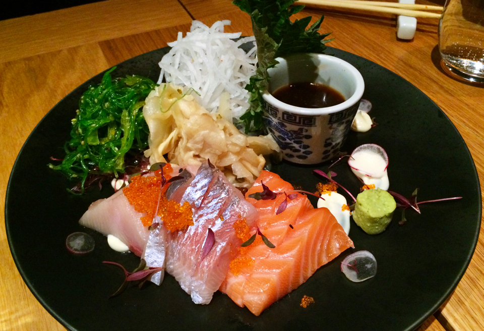 Fresh-puolelta valinnaksi osui Sashimi tasting, jossa pienen sashimi-lajitelman (lohta, siikaa, isopiikkimakrillia (tai mikä lieneekään yellowtail/hamachi suomeksi) kaverina mm. mätiä, wasabi-yuzu-kastiketta, wakame-leväsalaattia ja wasabi-majoneesia. Sashimi yleensä maistuu, niin tälläkin kertaa – lisukkeista leväsalaatti oli itselleni uusi mutta mukava tuttavuus. Valittu grüner veltliner toimi myös tässä peräti mainiosti.
