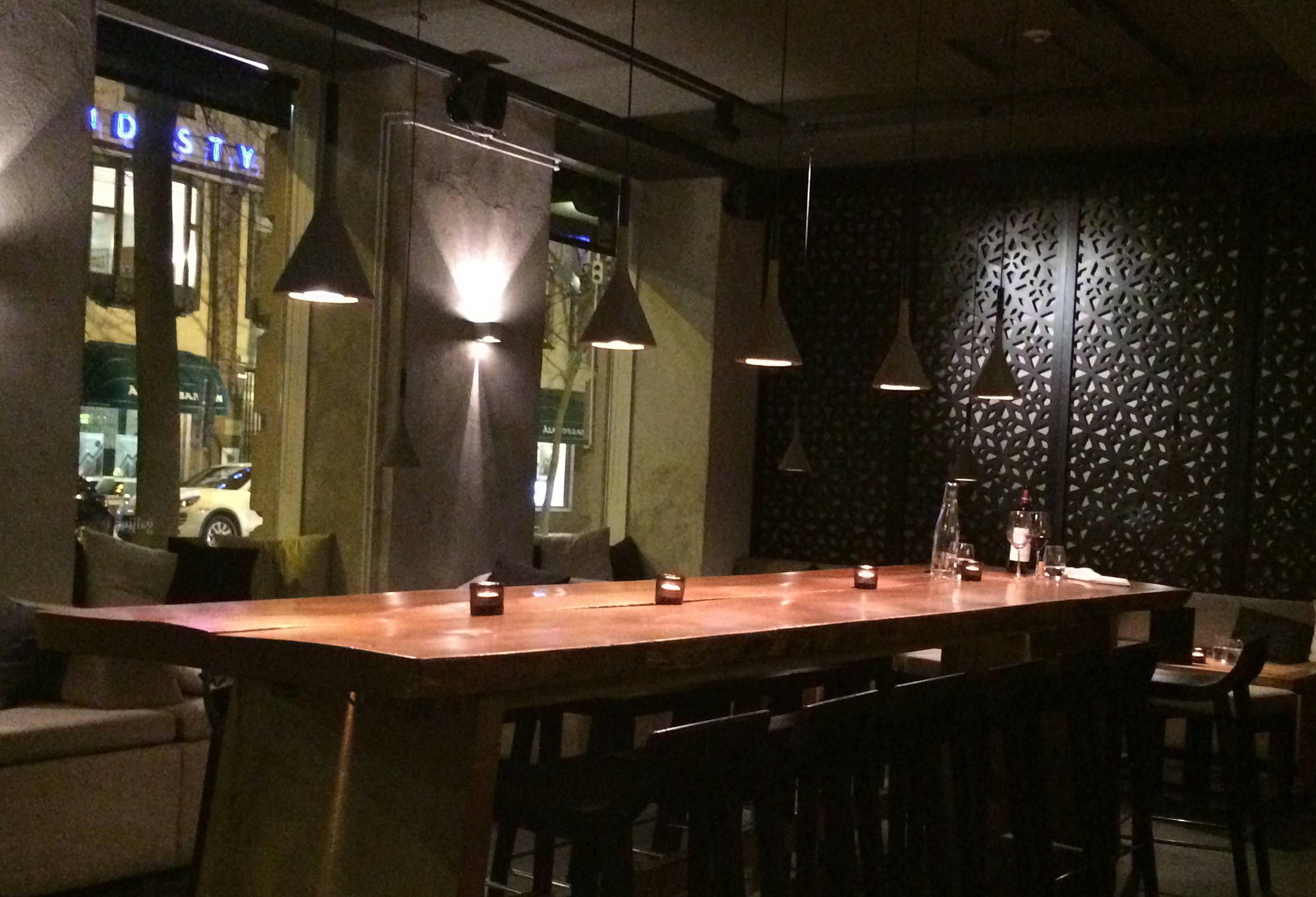 Illan hetki oli jo edistynyt, joten pitkään menuun emme sortuneet vaan otimme jokusia pieniä paloja alkuun ja päänumeroksi uutuutena tarjolla olluttta kobe-härkää. Aperitiivejä oli jo nautittu vähintään tarpeeksi edellisissä paikoissa, joten kiinnostava drinkkilista piti ohittaa. Ihan kuivin suin ei toki sovi olla: pikkupalojen kanssa osaavan oloinen tarjoilija ehdotti itävaltalaista grüner veltlineriä Laurenz V. Forbidden Grüner 2012 – omaan makuuni siinä oli juuri parahultaisesti pientä makeutta, joten sen siivillä eteenpäin.