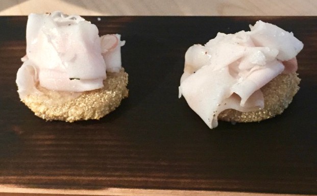 Ennen varsinaisia menun annoksia saatiin kuitenkin hiukopaloja muutama satsi: Ensin tuli ravintolan oman meijerin viiliä puolukkamyslin kera petrimaljan kaltaisessa kipossa – maultaan hyvin lempeää ja rakenteeltaan varsin pehmeää hapatusta. Seuraavaksi maisteltiin erinomaisia savumuikkuja, mummonkurkkuun käärittyä kylmäsavustettua lohta sekä naurissiivuun taiteltua hevosen suolalihaa. Talon omat hapankorput olivat perin mainioita. Viimeinen amuse oli lämmin perunarieska, jonka päällä sopivan pehmeää, lähes sulavaa suolattua speckiä.