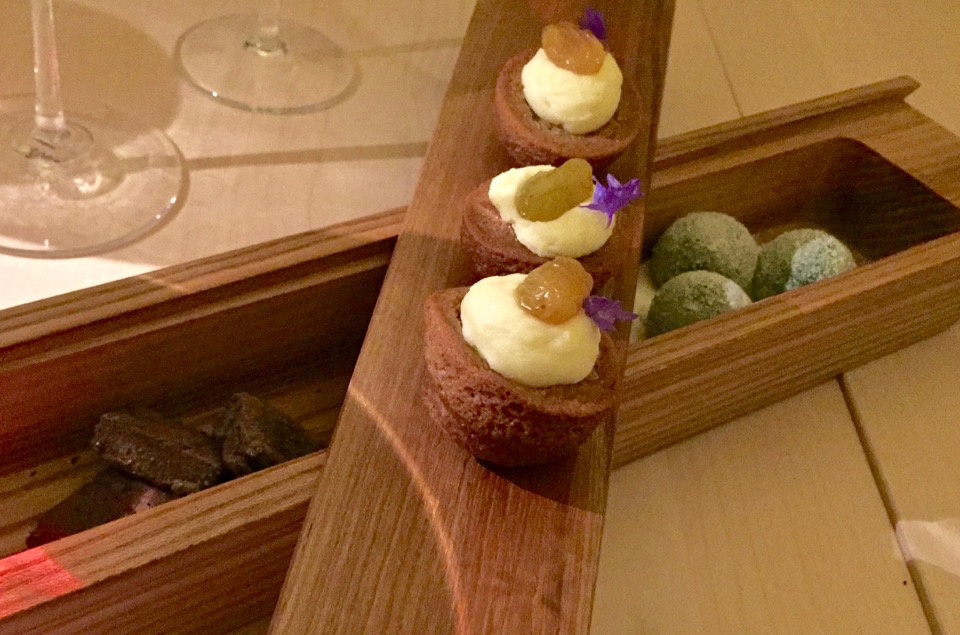 Ensimmäinen menun ruoka oli nimeltään mähnä ja sisälsi muikunmätiä, oman mejierin hapanmaitotuotetta (tarjoilijan mukaan crème fraîchea, menun mukaan jogurttia), puffattua tattaria ja tillikastiketta. Mädin (tai mähnän, kuten myös koillissavolaiset isovanhempani sanoivat) suolaus oli täydellinen ja maitovalmisteen hapokkuus lempeä, kuten Finnjävelin meijerin tuotteissa tuntuu linja olevan. Juomaksi kaadettu moselilainen Van Volxem Saar Riesling (2014) sai kalaiset maut korostumaan hienosti.