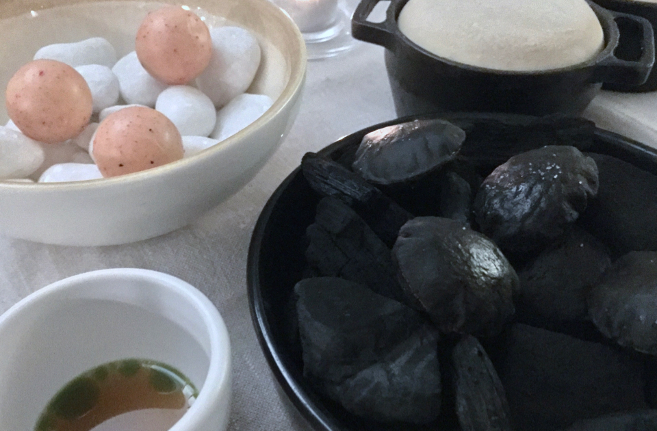 Benoît Lahayen samppanjalla aloitettiin, synttäreitä kun vietettiin (ikään kuin samppanjalle tarvisisi jonkin syyn..) Sen kanssa oli mukavaa napostella ensimmäiset viisi annosta sormisyötäviä: perunaa ja vuohenjuustoa eli perunakeksin päällä vuohenjuustoa, kuivattua kananmunan keltuaista ja ruohosipulia; silliä ja rapeaa leipää hauskasti hiilenmustan leipäkeksin sisällä silli-cremeä; ja vielä suosikkini kananmaksaa ja kanalientä, kuin pyöreänä konvehtina kananmaksamoussea ja omenaa, lisänä kupposellinen lämmintä kanalientä.