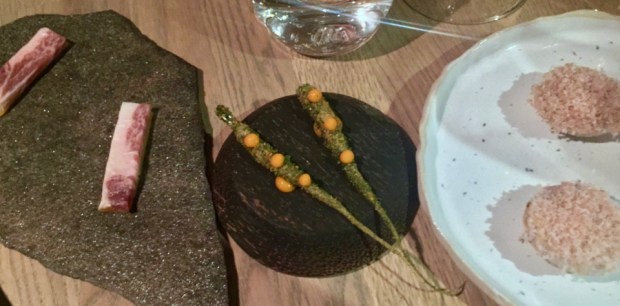 Seuraavaksi muutama amuse: mangalitsa-possua suolattuna, pikkelöityä porkkanaa kuivatulla porkkananlehdellä ja tyrnillä koristeltuna sekä pellavansiementartarletti, jossa valkohomejuustoa ja kuivattua härkää. Tartaletti oli erityisen herkullinen, mutta maukkaita pikkupaloja jokainen – jopa porkkana tavoistaan poiketen osasi olla hyvää!