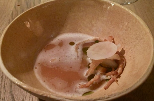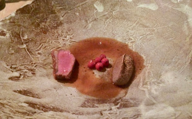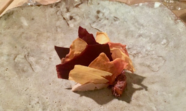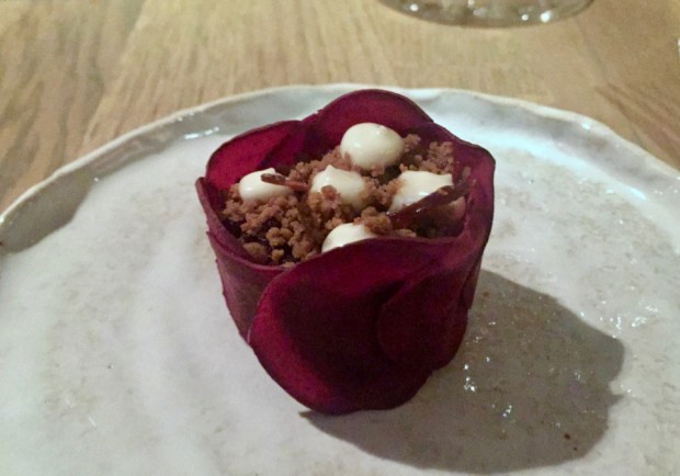 Seuraavana maan antimena oli punajuuri: ruusuetikassa marinoiduista punajuuriviipaleista sommitellun ruusukkeen sisällä paahdettua punajuuritartaria, jonka mausteena paahdettua hiivaa, savumajoneesia ja mustaa valkospipulia. Erinomaiset maut! Lasiin kaadettiin loirelaista Domaine de l’Ecun biodynaamista Janus-chardonnayta.