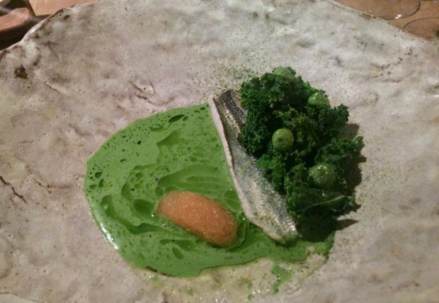 Seuraavaksi jo kalaa: silliä ja lehtikaalia. Omenaviinietikassa kypsytetty kevyesti savustettu sillifile oli saanut kaverikseen lehtikaalia paahdettuna ja emulsiona sekä kastikkeen piimästä, lehtikaalista ja meiramista, lisäksi oli tarjolla muikunmätiä ja mallasleipää. Silli ei ole erityisherkkujani, mutta tämä oli oikein lempeä ja maukas tapaus. Sama viini kuin edellä oli ihan ok pari tälle, vaikkei yhtäläinen nappiosuma kuin maa-artisokalle.