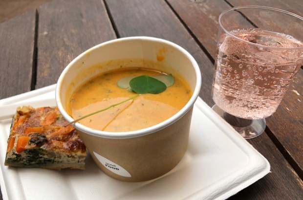 Pikku Pietarin torikujalla majaa pitävä PIKKU PIETARIN TALLIKAHVILA tarjoilli poimulehti-porkkanakeittoa ja villiyrttipiirakkaa. Porkkana ei ole suosikkejani, mutta keitossa se toimi hyvin lempeän yrttisyyden kanssa. Juomaksi otin kahvilan omaa tuotetta, horsmankukkakuohujuomaa, hennon makuista mutta oikein hyvää alkoholitonta kuohuvaa.