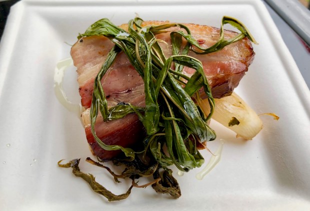 Sitten lihoihin. KUMMISEDÄN terassilla herkuteltiin porsaan kyljellä, sipulilla, mesiangervoalla ja maitohorsmalla. Todella mehevässä possussa oli hyvä hento savun vivahde, ja se toimi erityisen hyvin mesiangervolla maustettujen suolapedillä paahdettujen salottisipulien kanssa. Juomana taas kuusenkerkkää, nyt Kyrön bitterin kera.