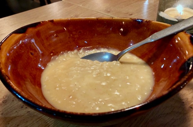 Päivän risotto oli maustettu hiiligrillissä kypsytetyllä juurisellerillä, jonka risottoon oli koverrettu aromikasta sisusta. Risoton koostumus oli sopivan löysä, jyvät ehkä vähän pehmoisia mutta ihan riittävä purentavaste kuitenkin. Varsin onnistunut selleririsotto! Viini toimi tähänastisista ehkä parhaiten juuri tämän kanssa.