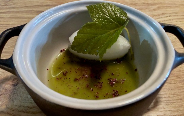 Suunraikastin eli ”Freshen up – vaihtuvia makuja raikastamaan makupalettia” oli seljankukkasorbetti  herukkaliemessä, mukana myös  pikkelöityä herukan lehteä ja kuivatun punakaalin murusia. Liemi varsinkin melko voimakasta maultaan, mutta sorbetti teki hyvin tehtävänsä eli raikasti suun valmiiksi seuraavia makuseikkailuja varten.