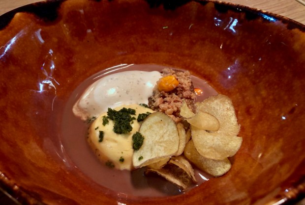 Seuraavaksi perunaa, ruista & sipulia. Perunat on fritattu leipätaikinakuoressa, mukana myös punasipulia ja karhunlaukkaa pikkelöityinä, sipulilientä ja geeliä pikkelöintiliemestä. Hyvin maistuu peruna uppopaistettunakin ja sipulit antavat kyljessä pikantin vivahteen. Liemi varsinkin oli hörpättävän maukas.